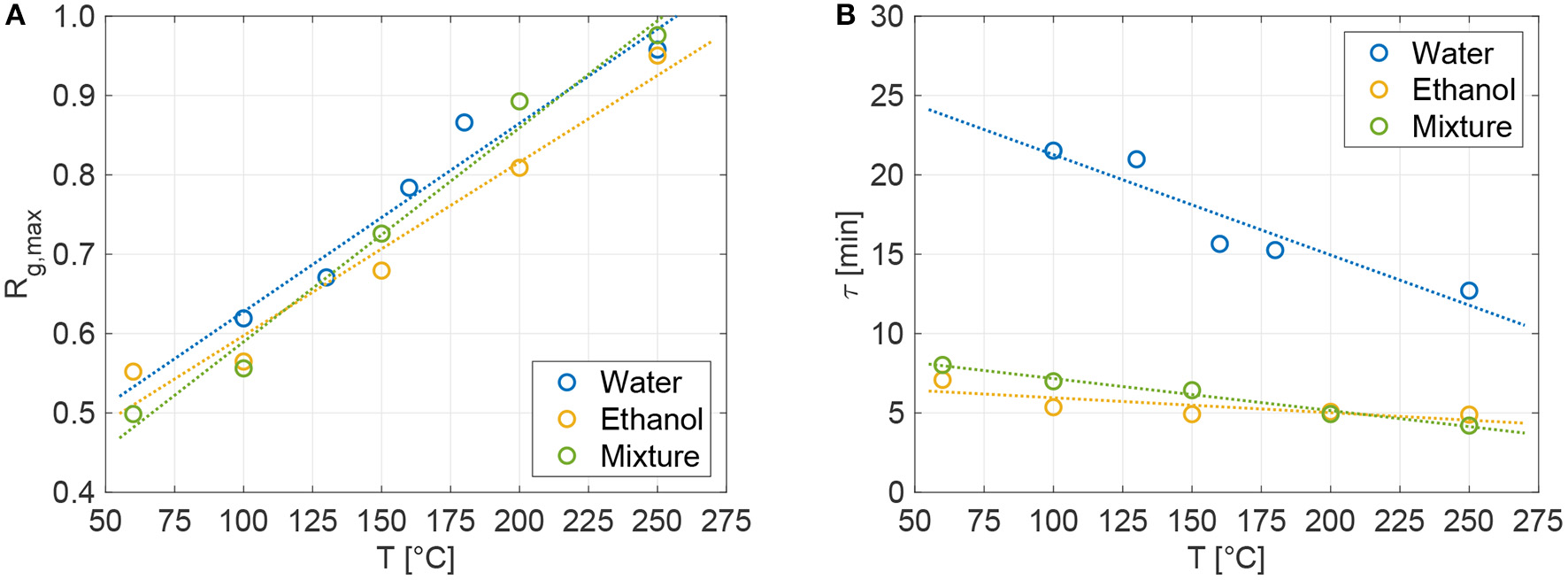 with Rg,max being the maximum regeneration grade and τ the characteristic regeneration time per each sorbent-sorbate pair and temperature. The characteristic regeneration time is the time constant of the exponential-decay term in the above equation, and represents the time at which the regeneration grade is around 63% its maximum value. All the obtained experimental series (dots in Figures 3A–C) have been best-fitted with the proposed exponential form in Equation (5), obtaining the maximum regeneration grade and characteristic time (constant) per each tested temperature. The resulting functions are shown in Figure 3A (water, R2 ≥ 0.98), Figure 3B (ethanol, R2 ≥ 0.85), and Figure 3C (mixture, R2 ≥ 0.92) using solid lines. Figure 4A shows that the best-fitted Rg,max are linearly dependent on temperature; whereas, no significant differences are observed between the three tested fluids. Instead, Figure 4B shows that water has slower characteristic regeneration times τ with respect to the other tested sorbates. This implies that ethanol and mixture completely regenerate in around 30 min, while water still regenerates after 60 min and, according to the results of the fitting, would require longer times to eventually achieve the maximum possible regeneration at a given temperature. Indeed, while the characteristic release times of ethanol and mixture slightly change with temperature, the water release time is remarkably more sensitive to temperatures.