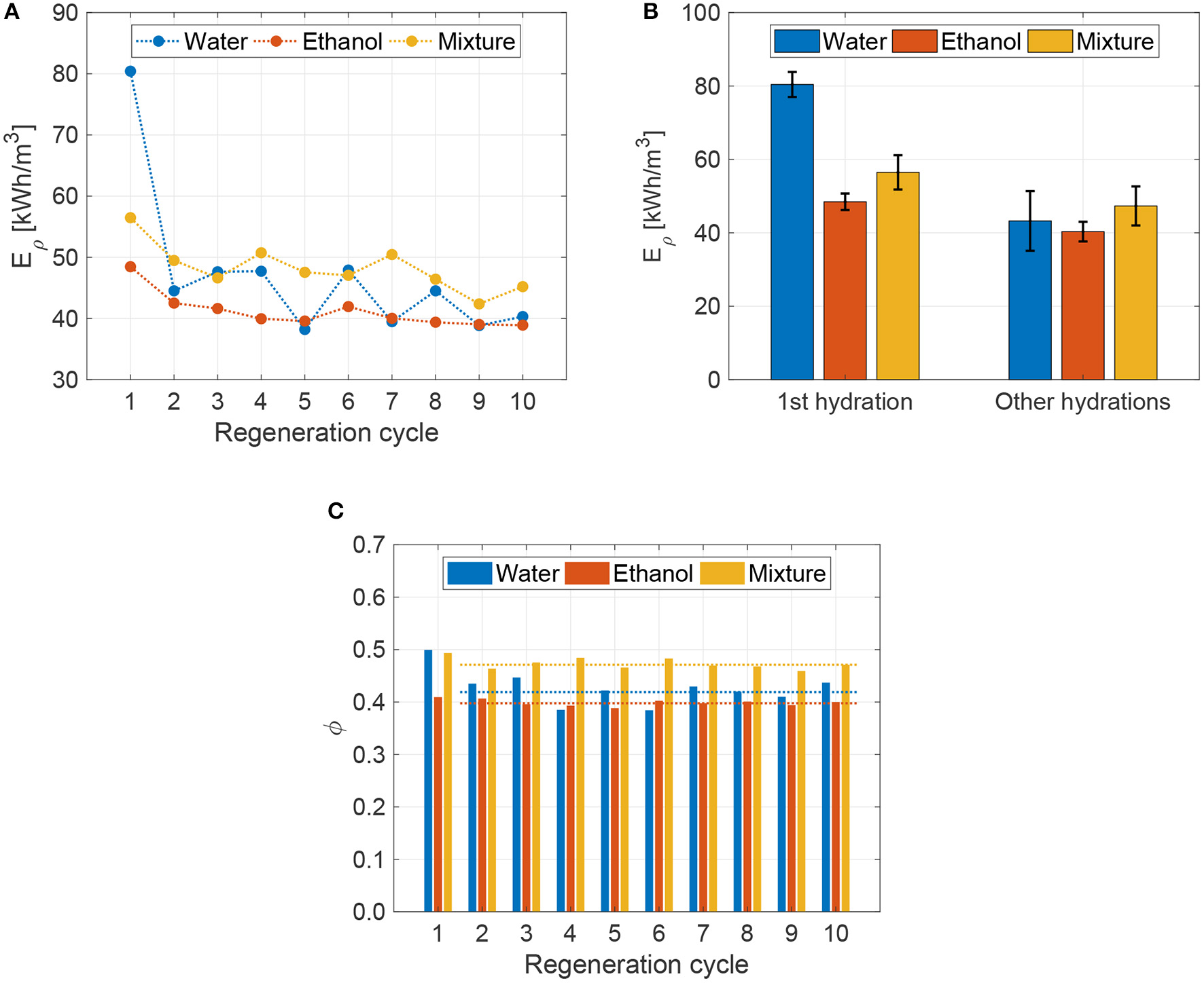 Figure 5C reports the fraction of loaded sorbate with respect to the sorbent mass for 10 successive hydration/dehydration cycles. These results confirm that the employed dehydration process (20 min at 250°C) is suitable to (almost) fully regenerate the zeolite from ethanol and mixture; whereas, a substantial amount of water remains in the zeolite pores after the regeneration. In detail, the mean hydration of regenerated zeolites is: ϕ = 0.42 ± 0.04 for water, ϕ = 0.40 ± 0.01 for ethanol, and ϕ = 0.47 ± 0.02 for the mixture, where quantities are reported in terms of mean ±2 standard deviation. By comparing these results with the ones in Figure 2, ethanol shows no performance degradation in terms of hydration capacity with respect to the new samples of zeolite, while water presents a 16% reduction in the hydration capability. Remarkably, the mixture maintains similar hydration performance to that of the new samples of zeolite (only 2% reduction).