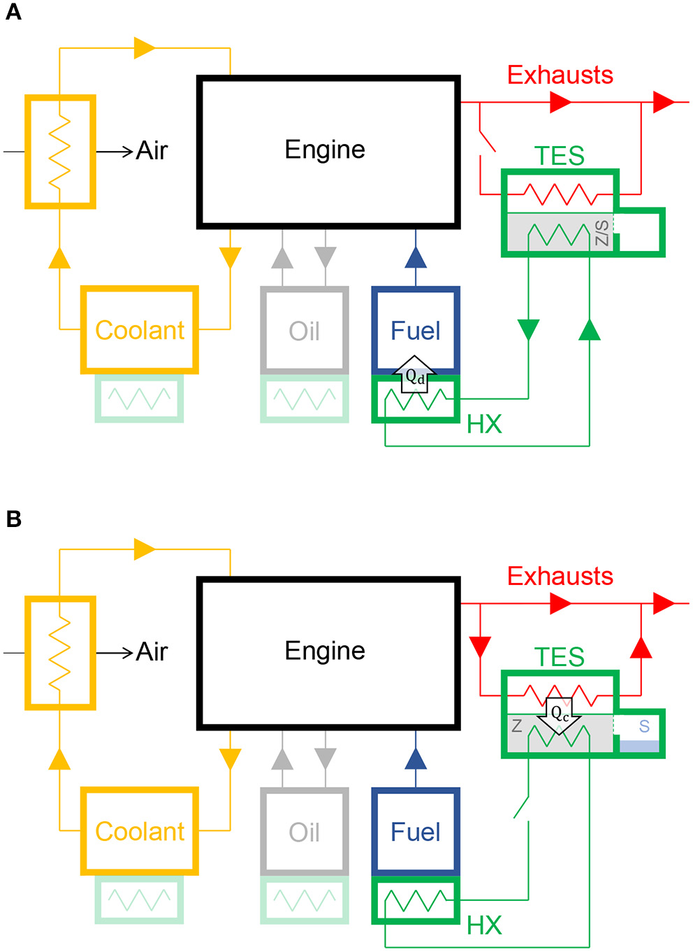 Schematics of a Thermal Energy Storage (TES) system based on the proposed zeolite sorbent and liquid sorbate to pre-heat the fuel and/or lubricant (oil) and/or coolant of a Diesel engine of an electric stand-by generator set (F9.5-1 by FG Wilson) during the cold-start. (A) Heat discharge phase: the liquid sorbate (S) is released into the chamber containing the zeolite (Z), thus hydrating it (Z/S). The thermal energy released by the hydration process is collected by a heat transfer fluid and then exchanged with the fuel and/or oil and/or coolant tank via an heat exchanger (HX). The energy provided to the engine fluids is equal to Qd. (B) Heat charge phase: the thermal energy recovered from the exhaust gases is employed to dehydrate the sorbate from the zeolite. The energy provided to the TES system is equal to Qc.