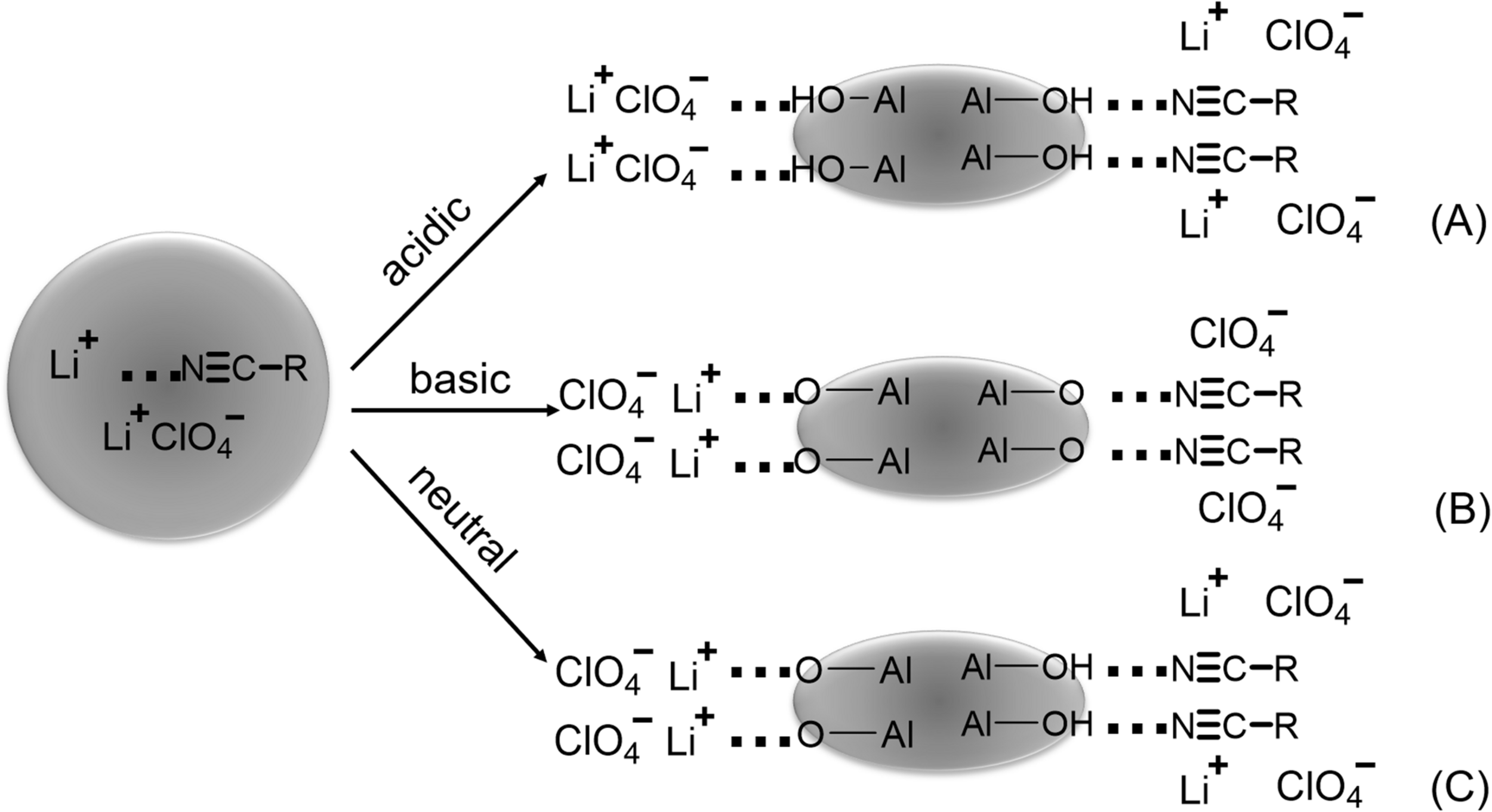 Schematic demonstration of the Lewis acid-base dissociation effects of (A) Lewis acidic, (B) Lewis basic, and (C) neutral surface groups on ionic conductivity. Reprinted with permission from reference Wang et al. (2003). Copyright 2003 The Electrochemical Society, Inc.