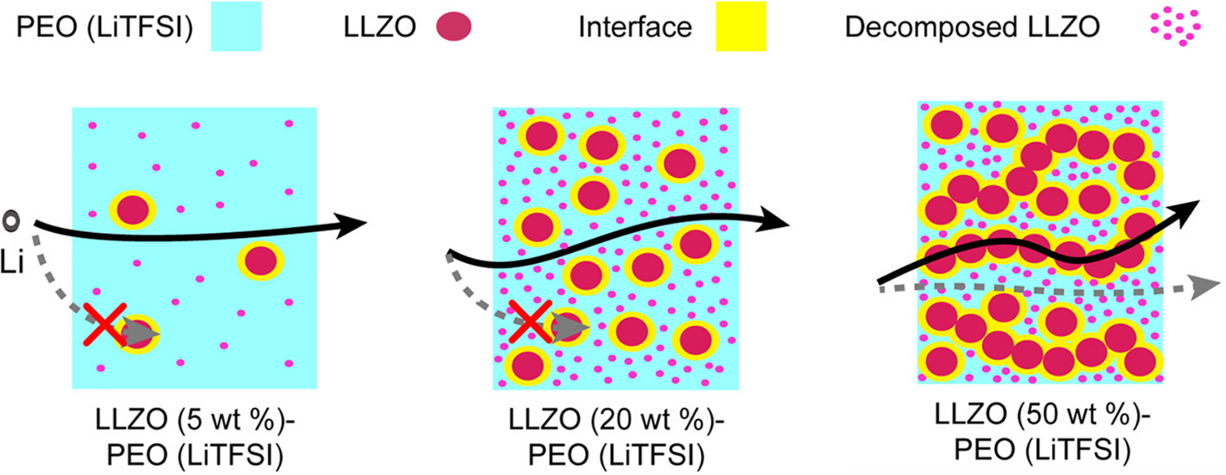 Schematic of Li-ion pathways for PEO (LiTFSI)/LLZO with LLZO concentrations of 5 wt%, 20 wt%, and 50 wt%. Reprinted with the permission from reference Zheng and Hu (2018). Copyright 2018 American Chemical Society.