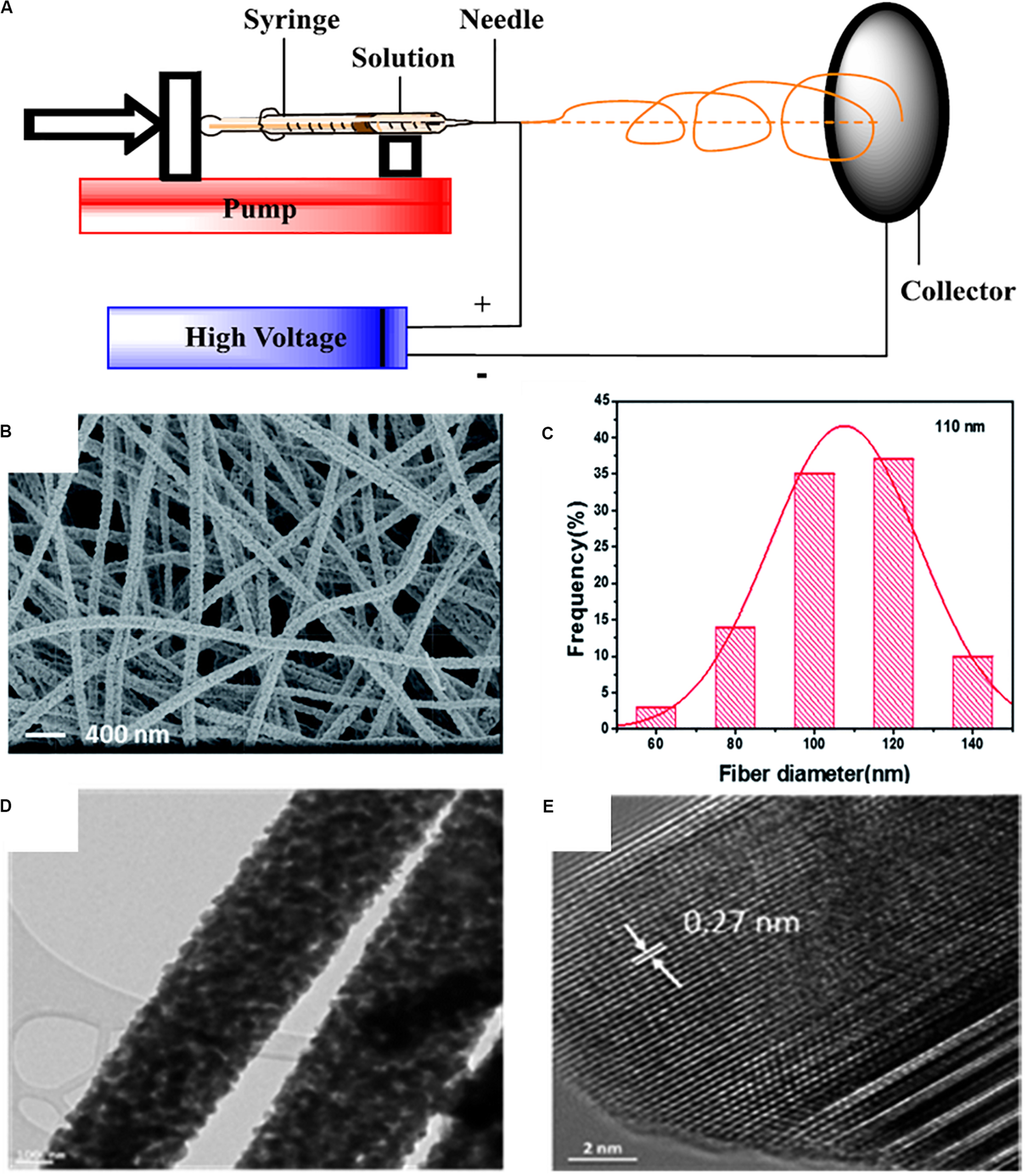 (A) Schematic illustration of the setup of electrospinning. Reprinted with permission from reference Zhu et al. (2016c). Copyright 2016 Elsevier. (B) SEM images of the prepared LLTO nanofibers and (C) the corresponding diameter distribution. (D) Low- and (E) high-resolution TEM images of the LLTO nanofibers. Reprinted with permission from reference Zhu et al. (2018a). Copyright 2018 Royal Society of Chemistry.
