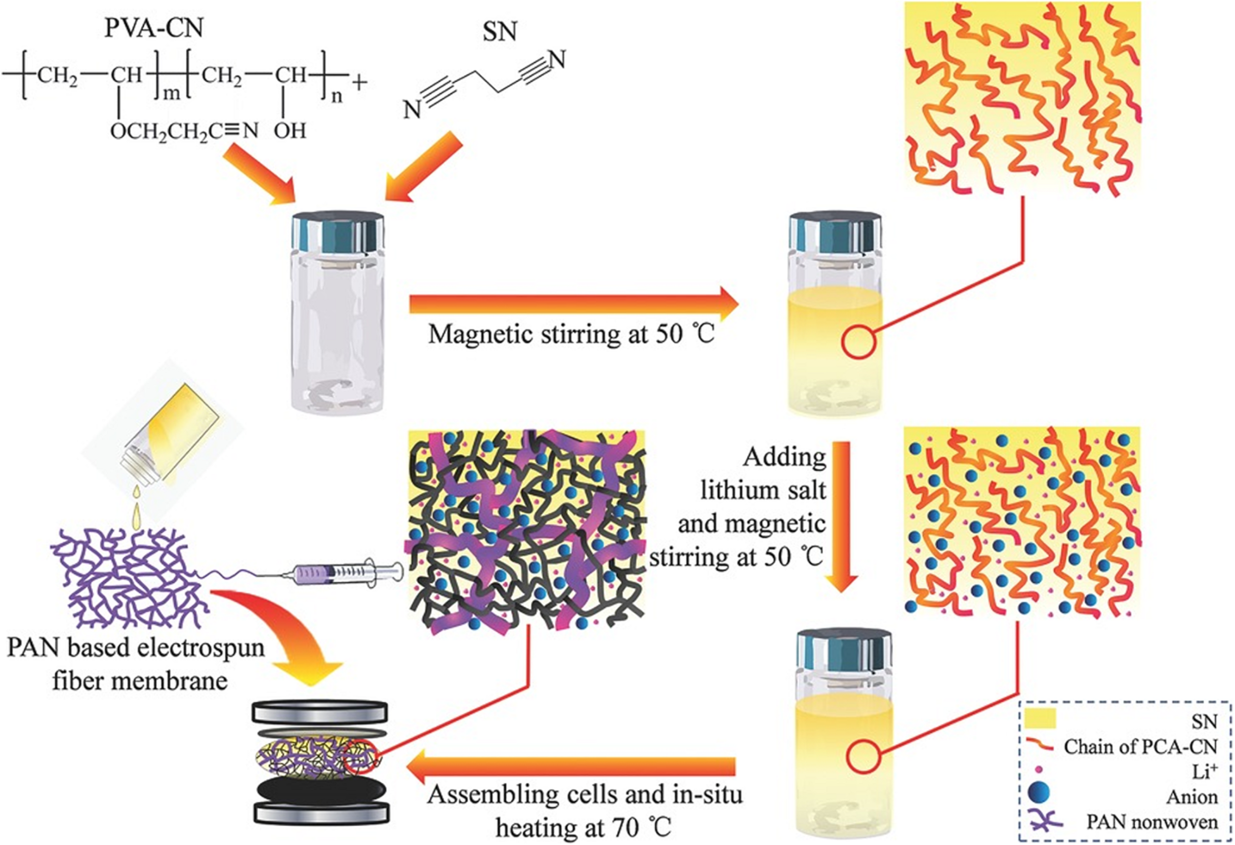 Schematic image showing the procedure for the in situ synthesis of solid-state electrolyte based on nitrile materials. Reference Zhou et al. (2015). Copyright 2015 John Wiley and Sons.