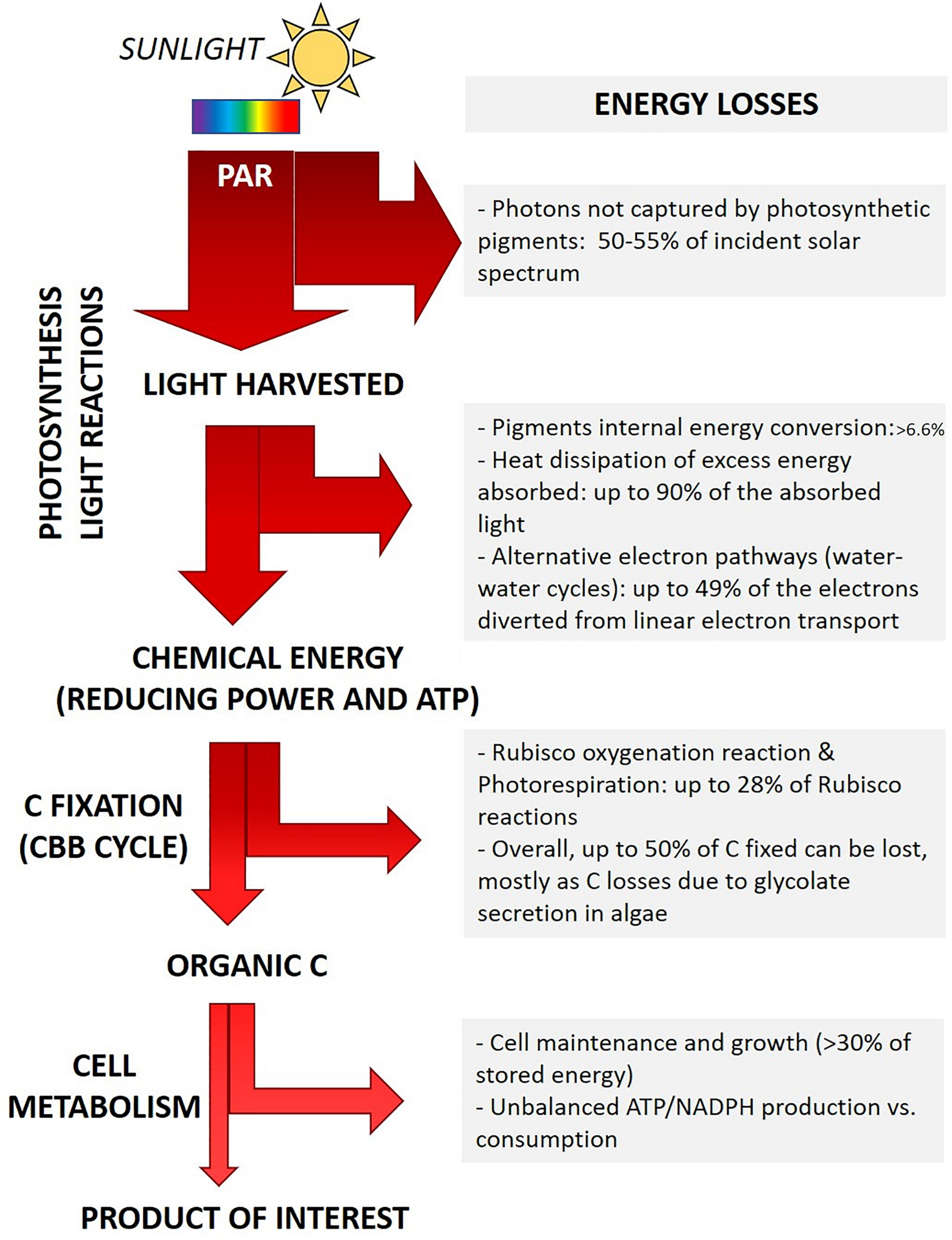 Already during the so-called light reactions of photosynthesis several factors contribute to the reduced final yield (Figure 2).