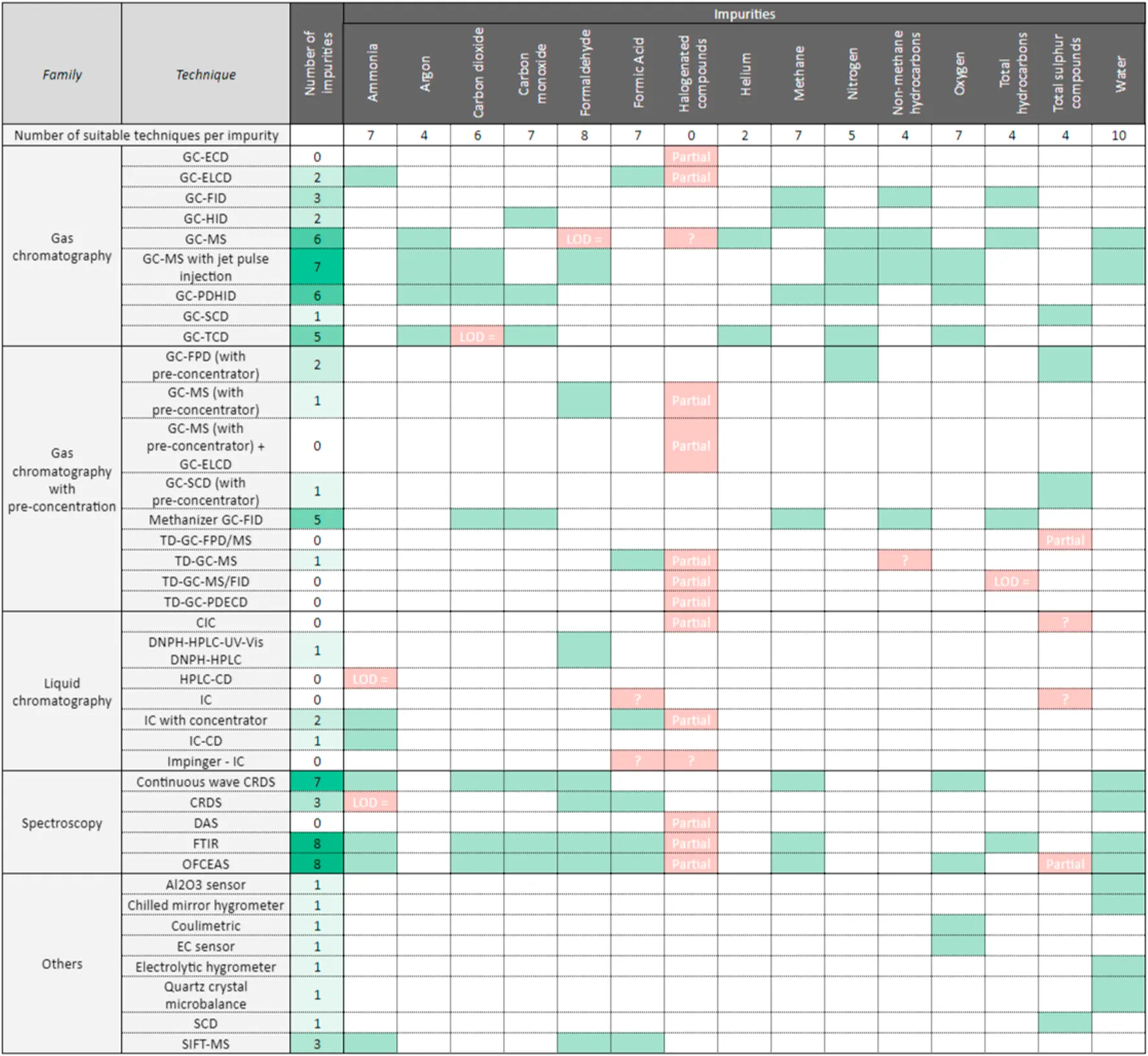 The review of the hydrogen contaminants analysis methods aimed at providing an overview of analytical techniques and methods capabilities based on the literature available, including standards published by different bodies (JIS for Japan, ASTM for the US and ISO for Europe and other countries). The review aimed at evaluating the analytical methods available for contaminants analysis in hydrogen fuel and to report critically the state-of-the-art. The methods will be presented in five families: gas chromatography, liquid chromatography, spectroscopic, other and new potential methods.