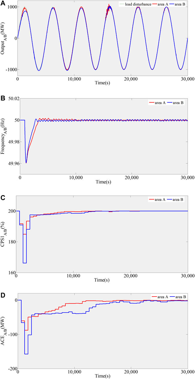 A continuous sinusoidal load disturbance with a period of 5,000 s and an amplitude of 1,000 MW is introduced into the two-area LFC model. Figure 4 shows the prelearning process of the two areas generated by the continuous sinusoidal load disturbance. As shown in Figures 4A,B, the GQ (σ,λ) algorithm can track the load disturbance quickly in two areas, and the frequency deviation is far less than the standard value and is relatively stable. The control performance of AGC is evaluated by the average value of CPS1 (CPS1AVE-10-min) and ACE (ACEAVE-10-min) every 10 min. As shown in Figures 4C,D, the index value of CPS1 in area A is kept in the qualified range of 180–200%, and the value of ACE is kept in the range of -100-0 MW until a stable value is reached. Meanwhile, the index value of CPS1 in area B is kept in the qualified range of 165–200%, and the value of ACE is kept in the range of −160-0 MW until a stable value is reached.