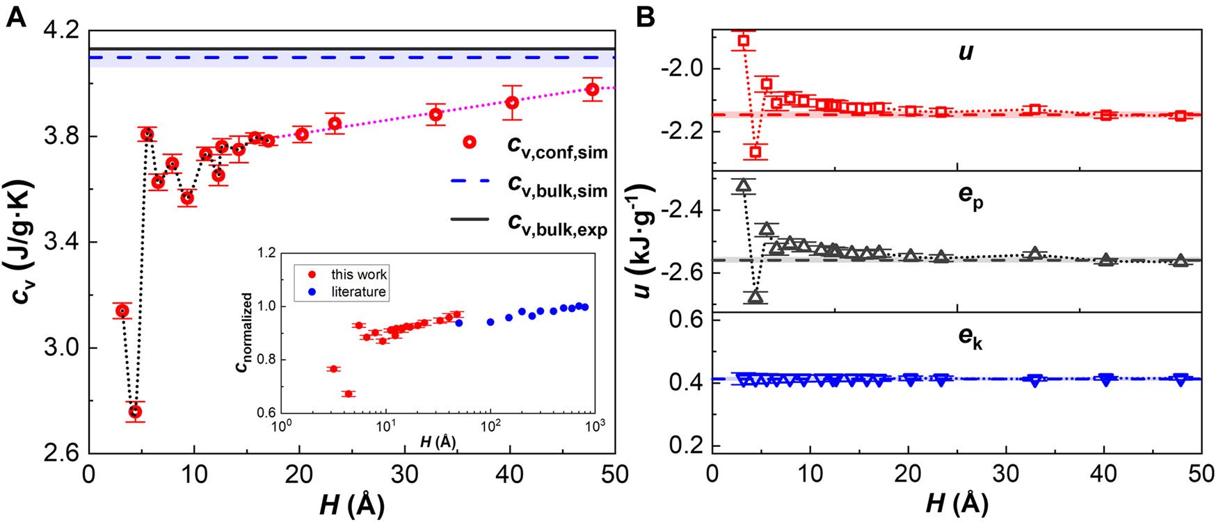 Specific heat capacity and specific internal energy at 300 K. (A) Specific heat capacity as a function of channel size. Dotted black line shows the fluctuations, dotted blue line represents linear fitting, and the turning point where they intersect corresponds to H = 5.5 σ. Inset: literature comparison (Jin et al., 2021). (B) Specific internal energy as a function of channel size. Dash lines represent the corresponding bulk value.