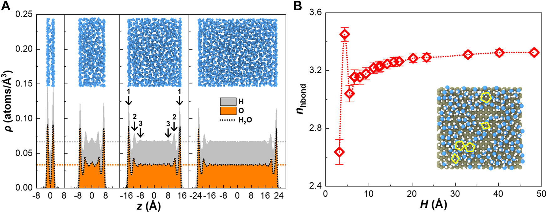 Density distribution and mean coordination number of hydrogen bond of water. (A) Density distribution of water perpendicular to the wall varies with channel height; the dotted horizontal lines refer to the bulk value; peaks corresponding to water layers are labeled with numbers; snapshots are configurations of water molecules represented by oxygen atoms, where water layers appear at two sides near the wall. (B) Mean coordination number of hydrogen bonds of water depends on the channel height; snapshot is the top view of the first water layer.