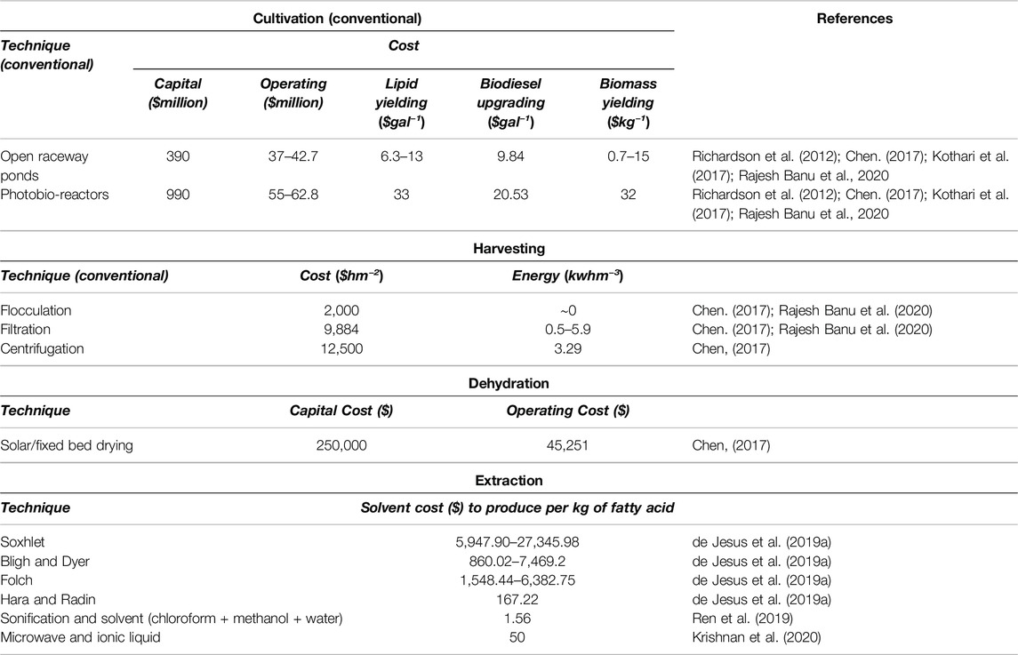 Dehydration/dewatering and the extraction of biodiesel ensue after harvesting. The cost of dehydration is derived from the use of energy and comprises the utility cost of the plant. The dehydration stage for ORPs has a high operating cost since the water is discharged in large amounts. Overall, the selection of different dehydration technology did not have a significant effect on the biodiesel production cost as most of the technologies had similar costs ($2.92–3.06/L biodiesel) (Chen Jiaxin et al., 2018). The high capital cost of solvents for the extraction process is also another major limiting factor in economical biodiesel production. The high cost of green solvents makes it especially difficult to shift away from using toxic solvents (de Jesus et al., 2019b). In this regard, integrated approaches that utilize multiple kinds of solvents and combine physical methods can significantly reduce energy demand and cost.