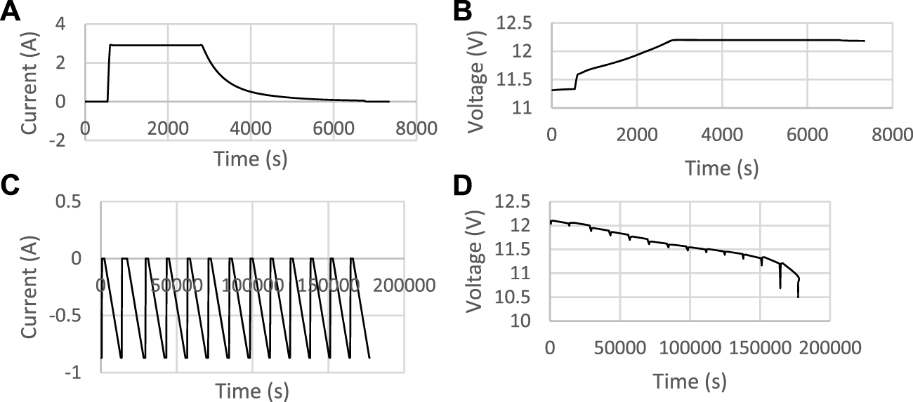A charge and discharge experiment was carried out on 4 No. 4-V and 2-Ah Panasonic’s lithium-ion batteries connected in a series at room temperature. The materials used and the experimental setup are shown in Table 1 and Figure 1, respectively. The charge experiment was made possible through the DC–DC converter passing the charging current at the 1 C rate to flow into the batteries. The current transformer (CT) rated 3-A measures the current and passes the signal to the 12-V digital Coulomb counter for the measurement of the capacity, voltage, and current information on the batteries. The BMS helps regulate the batteries from overcharging and discharging and monitors the maximum cut-off voltage of 4 V and minimum cut-off voltage of 2.7 V for each cell set by the manufacturer. The cut-off voltage set was required to protect the batteries from overcharging and discharging by disconnecting the load from the batteries whenever the limits were reached. This is crucial in ensuring the batteries maintain maximum capacity, increased life, and are not damaged in an excessive charge or discharge process. For the discharge readings, a 3.8-V, 2.35-Ah mobile device was used as the load connected across the batteries in parallel and to the Coulomb counter for the measurement readings to be displayed. The current and voltage profiles for the discharge and charge experiment are shown in Figures 2A–D, respectively. The positive and negative values of the current profile in Figures 2A, C show the batteries were charged and discharged, respectively.