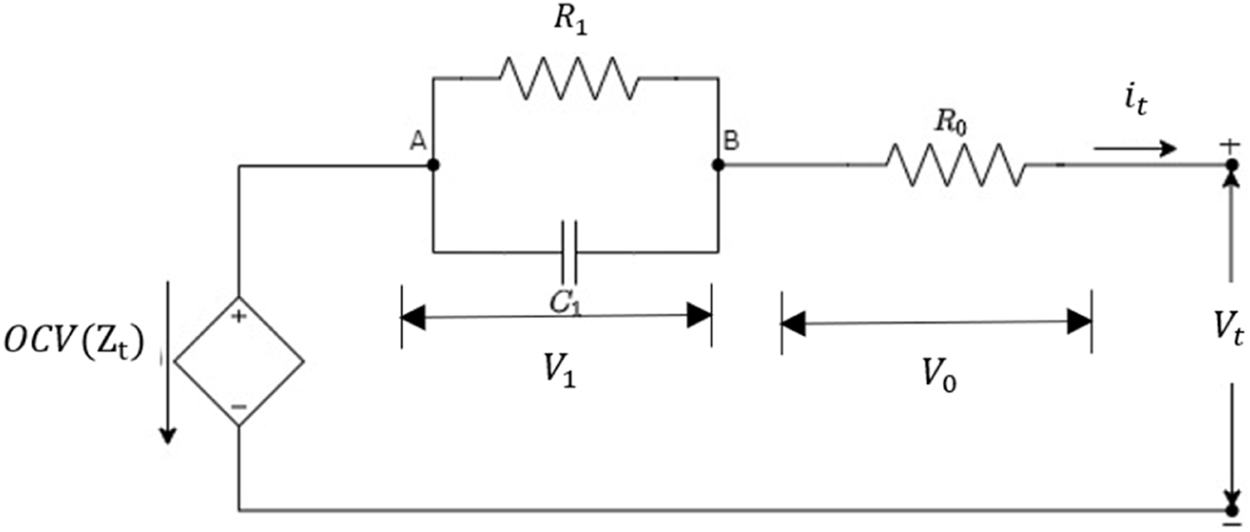 From the first-order ECM in Figure 3, the equations representing the state dynamics of the LiB is deduced as follows:where is the open-circuit voltage (OCV); is the battery current; is the voltage across the RC pair; is the nominal battery capacity. The SOC derivative equation in Eq. 20c is deduced from the relationship , which represents the current integration SOC technique.