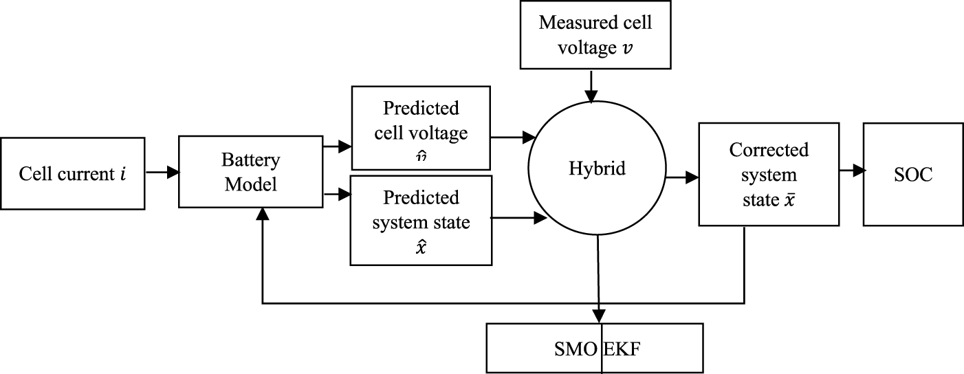 To obtain desired qualities associated with two or more SOC estimation strategies, hybridization is required. The unique difference between a hybrid state estimator and existing state estimators is that it offers an approach for combining the strength of noise filtration, a characteristic of the EKF, and robustness, an attribute of SMO, in predicting the SOC of batteries, thus producing a better adaptive system to the uncertainties that arise from the environment and measurement instruments. In addition, the hybrid system consists of a well-posed dynamic system and draws both discrete time and continuous time behaviors of EKF and SMO state estimation algorithms to improve the accuracy of individual methods.