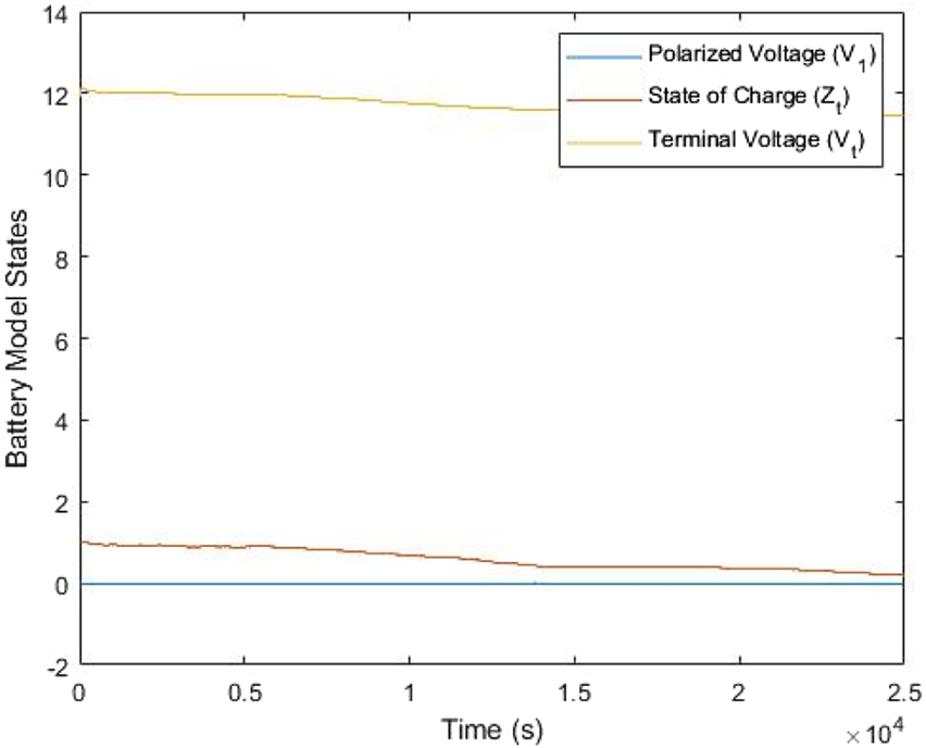 The discretization of Eqs 3, 4 is straightforward. Therefore, the battery model is represented in the state space form as follows:where is the state of charge, is the open circuit voltage of the battery at no load, is the battery-rated capacity, and is the battery ohmic resistance. The product represents the polarization time constant ; represents the current state of voltage across the capacitor and resistor . The model’s output represents the terminal or observed voltage, and the input is the measured current ; represents the battery coulombic efficiency assumed as 1 in this paper.