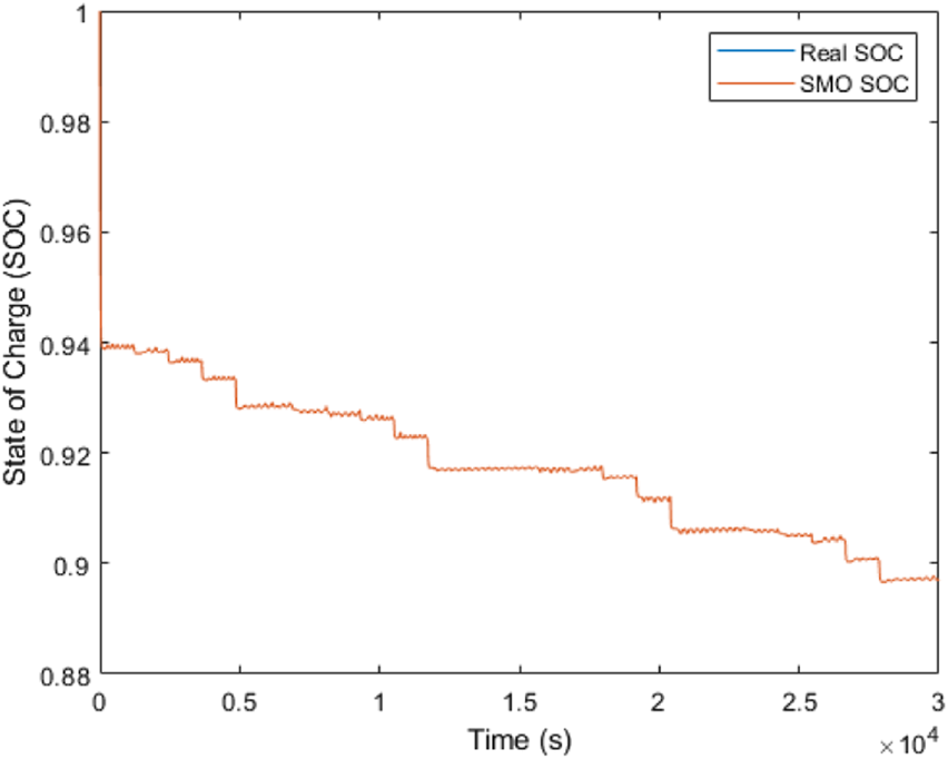 It is true that various hybrid estimation strategies have been developed in the literature such as by Alfi et al. (2014), where the radial bias neural network was used to obtain the output equation (linearized battery terminal voltage) so as to form a full state equation with the SOC variable in combination with the extended filter, which was used for estimating the SOC. A contrast between the proposed model developed in this paper and similar hybrid works is that this work combines discrete and continuous form representations of the model equations for the EKF and SMO, respectively, in order to improve accuracy. Furthermore, in comparison to the work introduced by Alfi et al. (2014), the accuracy of the estimation carried out in this paper does not depend on large discharge data required for neural network training since the algorithms used here are procedure-based. The estimation accuracy in this work showed that the RMSE using the hybrid neural technique performed better with a negligible error difference of .12 percent. However, matching accuracy between both methods can be achieved by proper tuning of the EKF gain in contrast to the hybrid neural technique, which depends on the trial and error method for selecting a number of hidden neurons and learning rates. With a convergence time of about 1 s, the proposed method surpasses the 4 min time it took for the extended filter to approach the real SOC, giving the former a significant advantage. These faster convergence characteristics can be attributed to accurate modeling of the battery in its non-linear form, as opposed to linearization carried out using the radial bias function.
