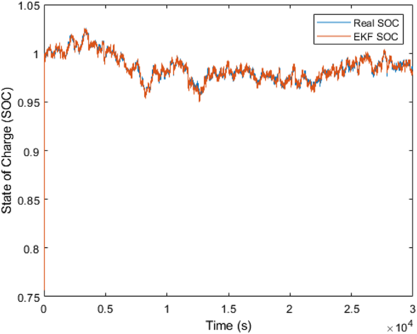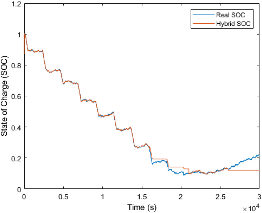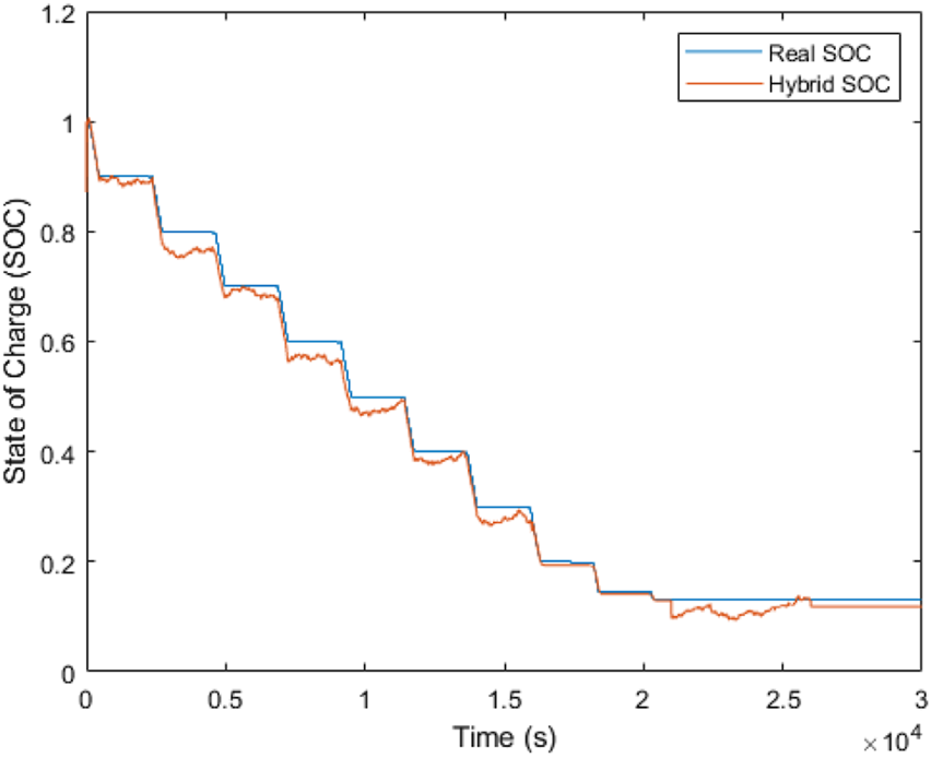 The hybrid estimator has also shown the ability to adjust its response to the measurement data on the INR 18650 used as the replica complex disturbance in Figure 13. It can be seen that unlike the EKF and SMO individual poor stability for parameter changes influenced by the chemistry of INR 18650, the hybrid estimator is observed to closely match the real SOC with the starting convergency time at nearly the initial time period, thereby supporting the merit of combining both estimators. Another observation from the result of hybridization is that the SOC estimation range has impressively improved from a range of [1, .93] to an estimation range of [1, 0], in spite of the disturbance addition. Varying the tracking gain of the SMO could increase the accuracy further but reduce the SOC estimation range. The hybrid improvement can be explained due to the role the tuning parameters of the EKF have in ensuring faster convergency and noise cancellation, and the role the SMO gains have in ensuring robustness.