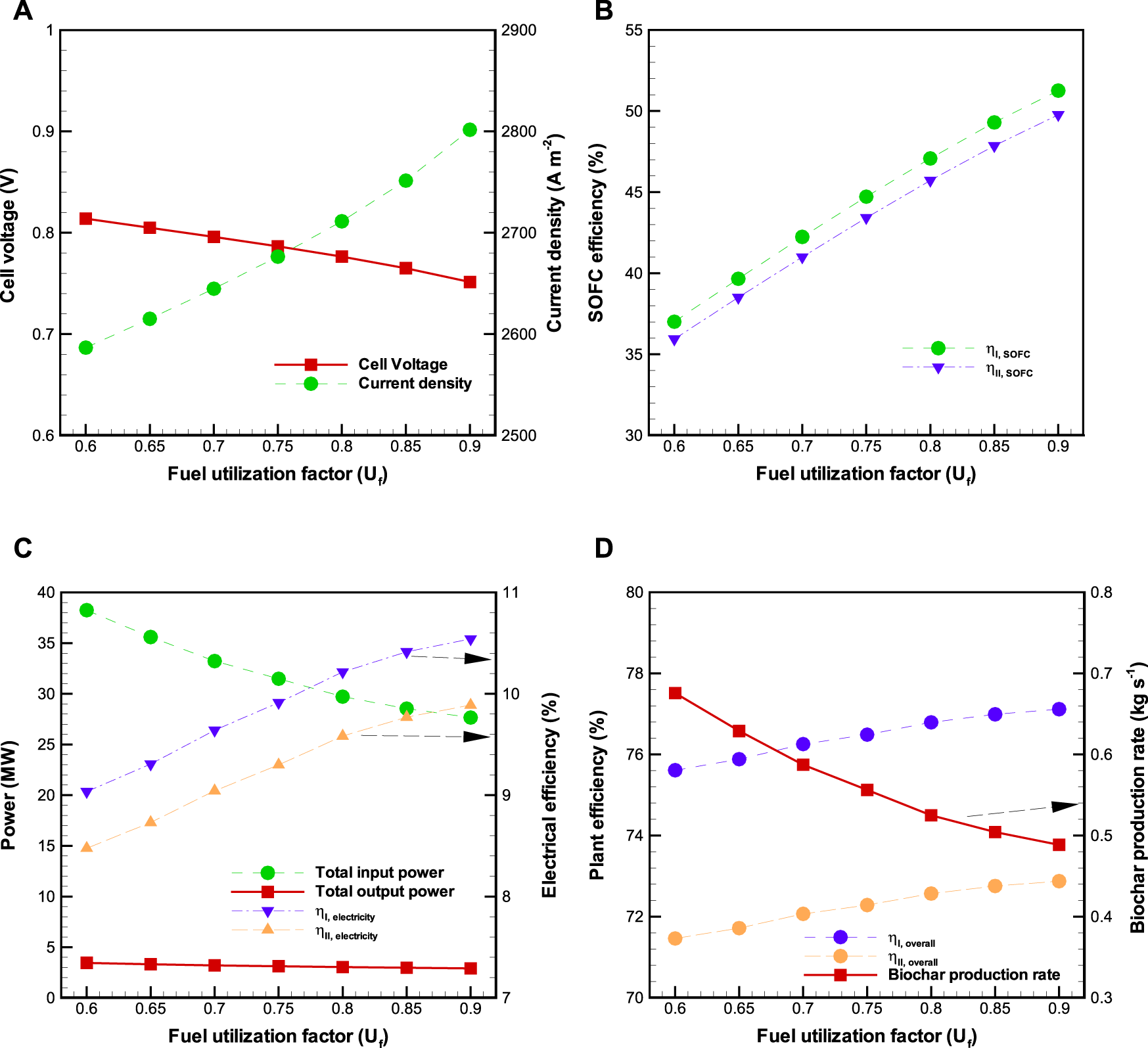 Based on the foregoing review of the literature, it shows that integrated BG-SOFC systems have been investigated extensively both in experiments and simulations, and few examined the use of integrating SOFCs with biogas reforming or chemical looping processes. However, an examination of the recent studies reveal that no research has been done to evaluate an integrated system incorporating biomass pyrolysis (BP) with a SOFC-CHP system for the NETs. Such sort of integrated system seems to be sustainable in nature and hence appropriate for energy and environment focused applications. For the aforementioned reasons, the present study aims to develop a BP-SOFC-CHP system for co-generation of biochar and power using Aspen Plus simulator, and then to examine the influence of operating parameters such as current density and fuel utilization factor () on the SOFC and overall system (BP-SOFC-CHP) performances in terms of energy () and exergy () efficiencies as well as biochar production. The BP is developed and established based on experimental data (Chen et al., 2016; Manyà et al., 2018) and a pyrolysis volatiles reforming unit is simultaneously considered and installed behind the BP to investigate the effect of reforming temperature () and biochar split ratio () on the overall system performance in detail. Finally, a stand-alone design for the BP-SOFC-CHP system is proposed, which can provide new and useful insight into the development of NETs.