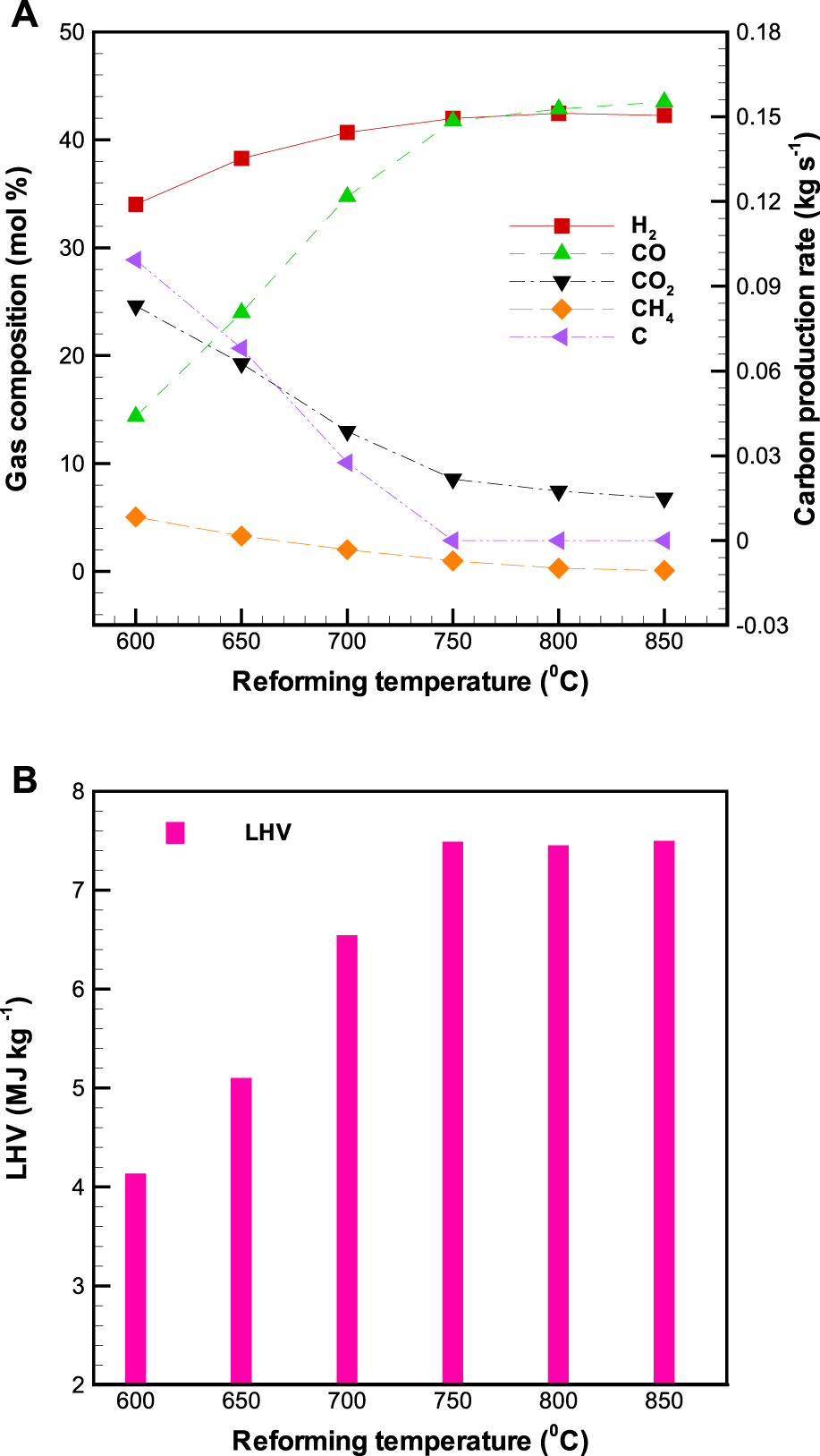| Pyrolysis volatiles reforming | Temperature (°C) | 600–850 | Xu et al. (2015) |