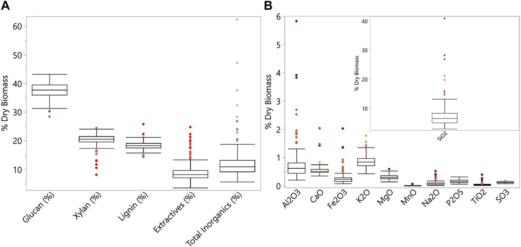 Boxplots for (A) chemical composition; n = 222, and (B) inorganic speciation; n = 191. SiO2 is broken out for a clearer view of the variable ranges of the other inorganic species.