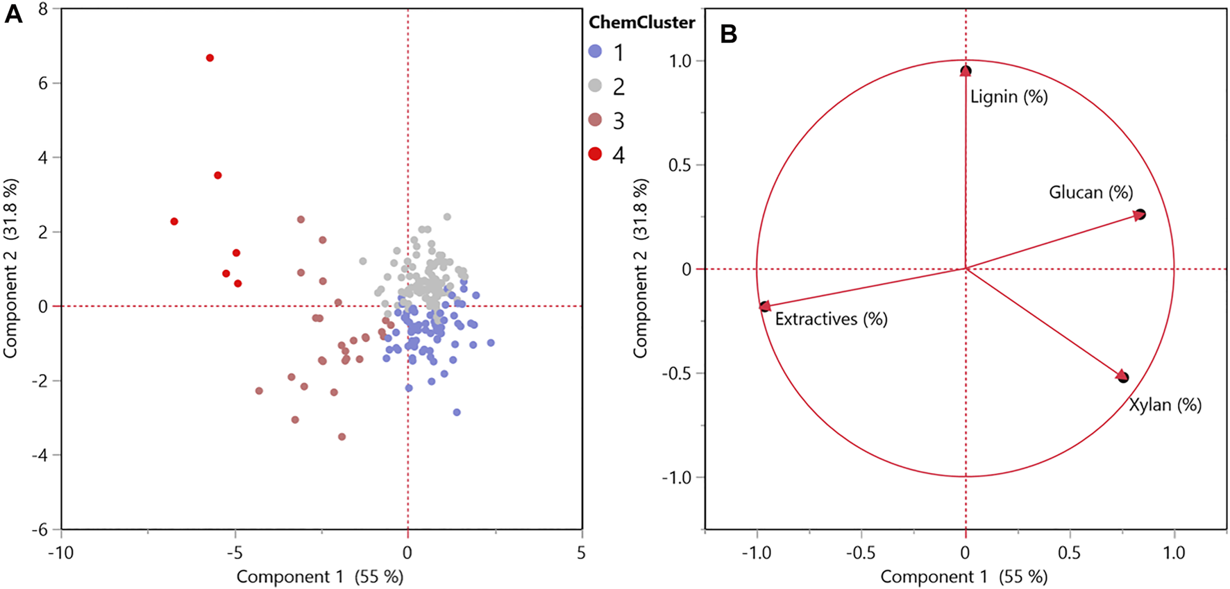 Figure 7A shows the resulting regression with the ash speciation clusters labeled, and Figure 7B shows the same regression with the chemical clusters, that were based on glucan, xylan, lignin, and extractives contents. Regression analyses highlight that for this dataset, the red channel relationships are being driven by the biological degradation severity, even with the highest ash sample in the data representing close to 62% total inorganics. The regression shown in Figure 7A includes SO3 and SiO2 content instead of total inorganics, as was included in the regression represented in Figure 4A, to represent the relationship of these intrinsic and extrinsic ash species to the image red channel intensity. Phosphorus and potassium oxides were not selected for the linear regression as representatives of intrinsic ash, as suggested by the principal component 2 in the principal component loadings plot (Figure 6B) as they did not significantly contribute to explaining the red variability. It should be noted that fewer samples in the dataset contained ash speciation compared to the organic composition data available (191 samples compared to 222 samples). Therefore, the coefficient changes cannot be directly compared to the model in Figure 4A; however, the general trends remain consistent. Both SO3 (representative of intrinsic ash) and SiO2 content (representative of soil contamination) significantly explain variability in the red channel (Table 3).
