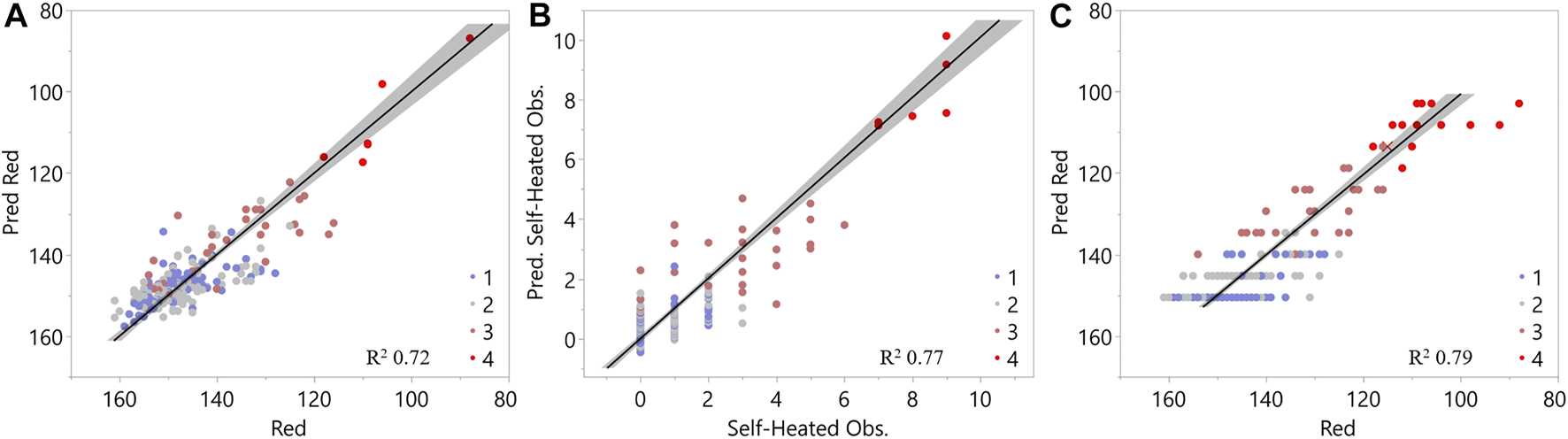 Figure 4A shows a linear relationship between the median red channel and the chemical properties of the samples and was used throughout the analyses. The red channel had the largest range of variability when compared to blue and green, high correlation to other factors used in regression analyses and was correlated to green and blue channels (Supplementary Figure S1, supporting information). Linear relationship factors were identified from chemical data using a stepwise technique as a function of their contributions toward explaining variability in the median red channel output, while minimizing multicollinearity between explanatory factors. For example, extractives and the interaction factor of (glucan x xylan) are highly correlated (Supplementary Figure S1, supporting information). Therefore, both were not necessary to explain the variability in the median red channel. The relationship between these chemical properties and the median red channel exceeds an R2 value of 0.7. Interaction terms between glucan, xylan, and lignin content were included in this analysis. Table 1 displays the standardized coefficients and relative significance level for each chemical material attribute from linear relationships in Figure 4A. These coefficients suggest that xylan was the highest contributor to explaining the variability seen in the red channel. At the same time, changes in glucan contribute the least in comparison to the other factors. This is consistent with prior work that demonstrated selective degradation of hemicellulose in response to biological heating during storage with cellulosic components involved to a lesser extent (Groenewold et al., 2020). Both factors indicate that as glucan and xylan contents decrease, the red channel signal decreases.