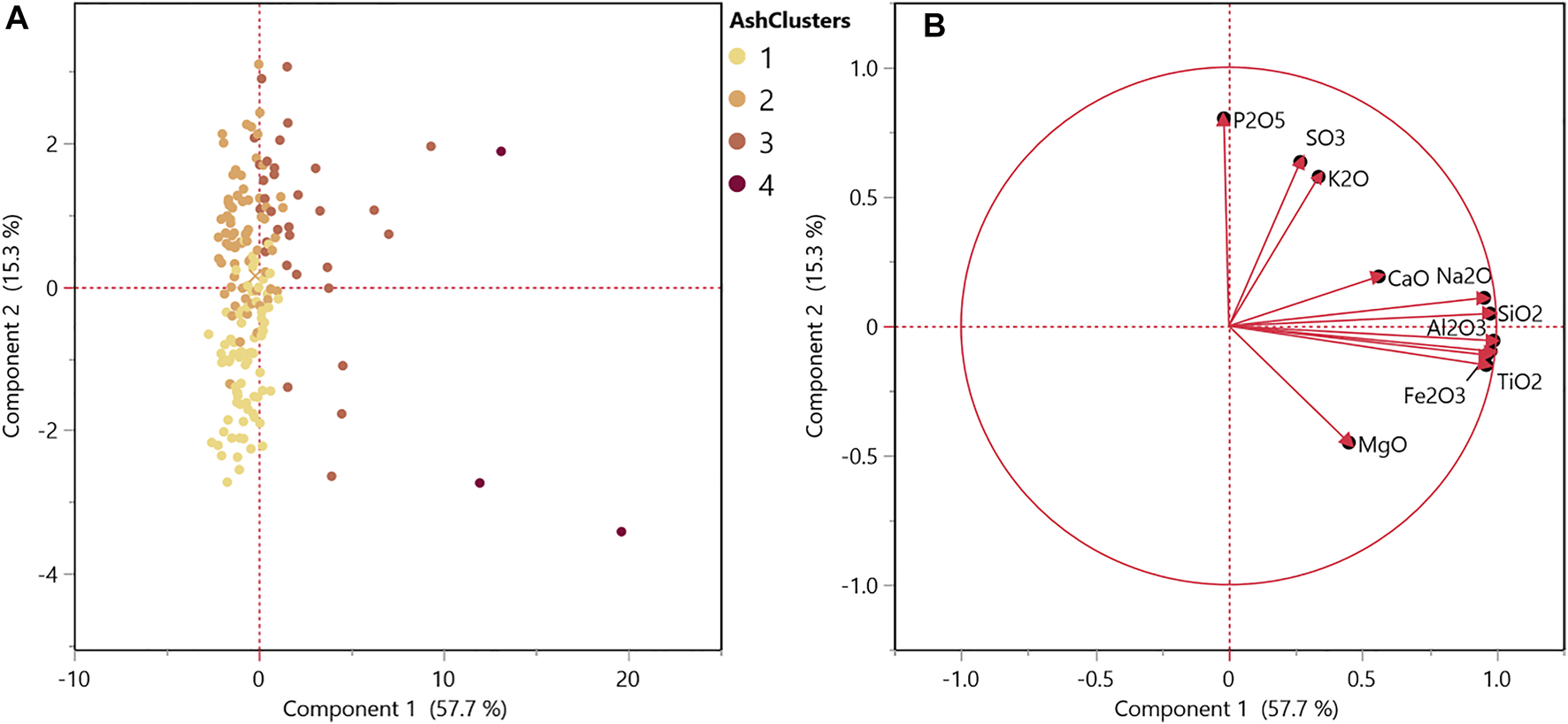 As shown in Table 1 and Figure 4A, the total inorganics content significantly contributes to changes observed in the red channel, suggesting that image analysis could provide a valuable tool for identifying levels of soil contamination. Hierarchical cluster analysis was used similarly on ash speciation data to identify distinct clusters based on inorganic features. Cluster 1 represents limited or no soil contamination, and cluster 4 represents high soil contamination. The PCA score plot (Figure 6A) displays these clusters. The variability in the 1st principal component suggests a relationship to inorganic species derived from soil contamination, including silicon and aluminum (Lacey et al., 2018). The second principal component relates to inorganic components that serve structural and physiological functions within the plant (i.e., biogenic ash), including sulfur, nitrogen, potassium, calcium, magnesium, and phosphorus (Thy et al., 2013; Li et al., 2020). The inorganic clusters 1 and 2 vary primarily based on intrinsic inorganic species inherent to plant biomass, and clusters 3 and 4 show relationships to soil contaminant inorganic species (i.e., silicon and aluminum).