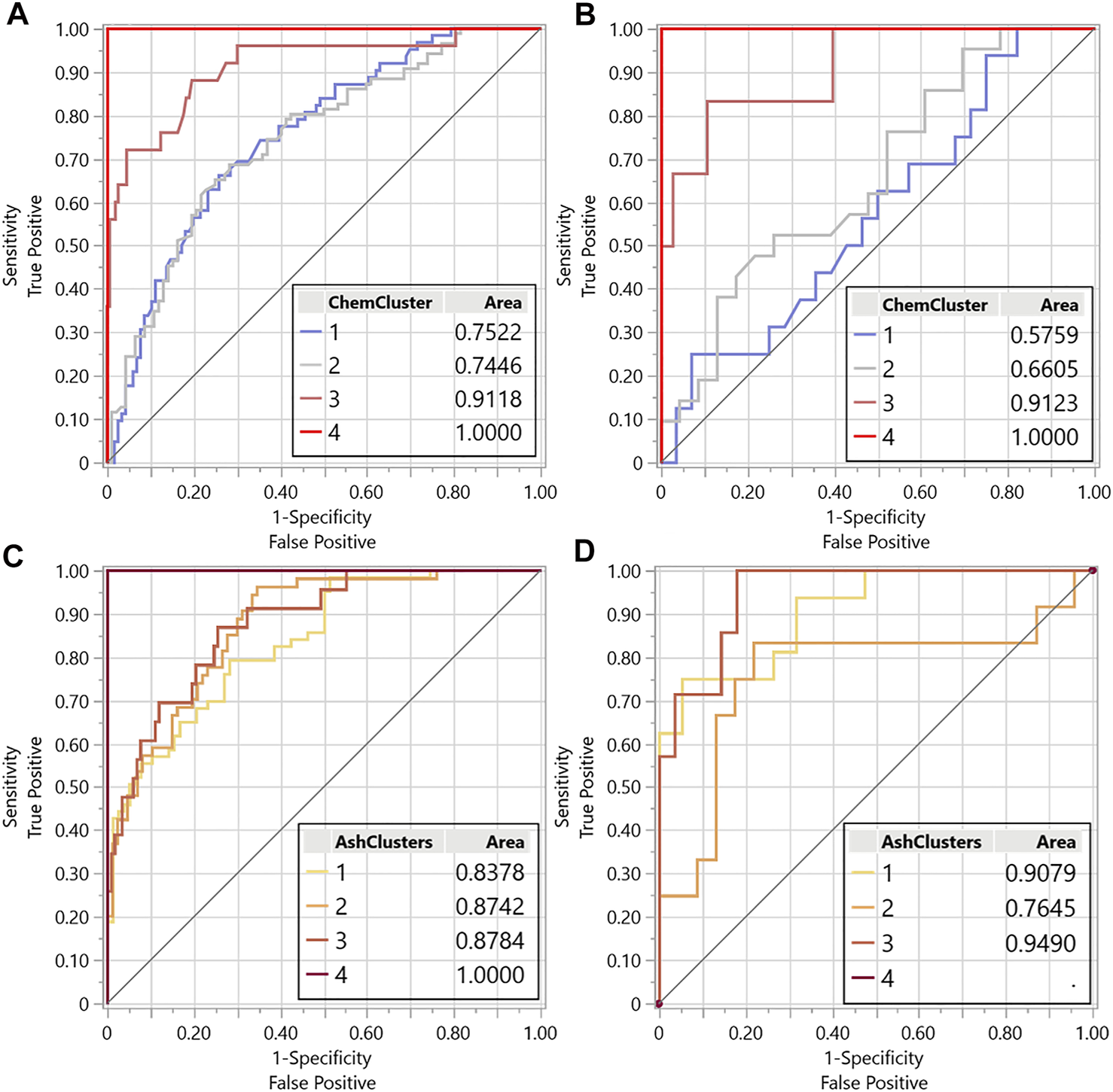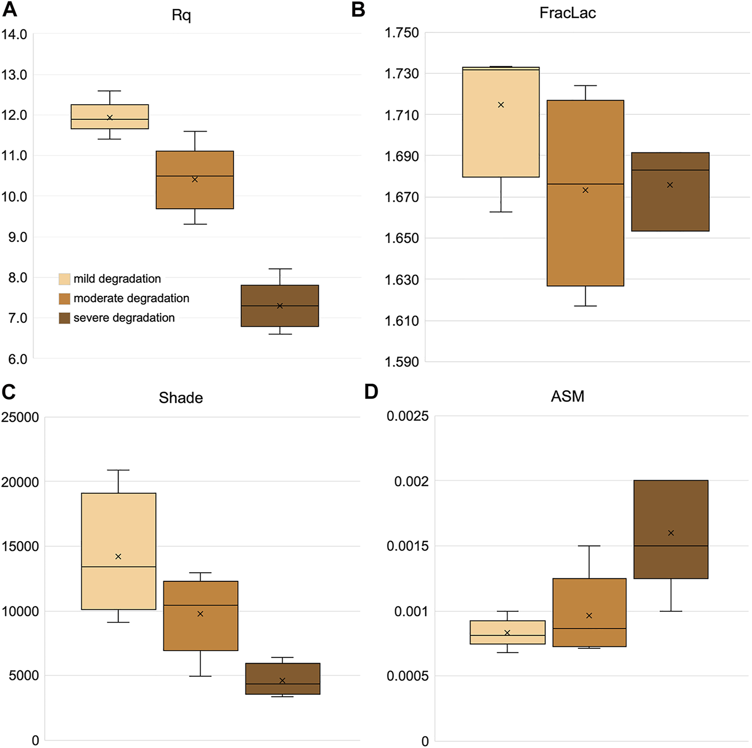The relationships observed between the chemical changes, image analysis of the red channel, and biological degradation observations generally align with the overarching hierarchical cluster grouping. Cluster 1 and 2 (Figure 3A) correspond with no or mild biological degradation, group 3 as moderate, and group 4 as the severely biological degradation samples.