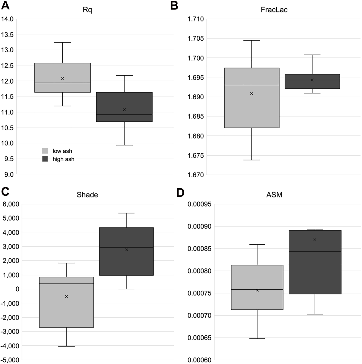Textural features of cropped images were quantified using the plugins SurfChar J 1q (Chinga et al., 2007), GLCM Texture Too (Haralick, 1979; Lan and Liu, 2018), and FracLac (Smith et al., 1996; Karperien et al., 2013). Before textural analysis, the original color corrected images were cropped to isolate a 900x900-pixel region-of-interest (ROI) centered on the sample cup. Then, the color information was discarded in the image of all subsequent texture analyses and used either 32-bit (SurfCharJ) or 8-bit (GLCM and FracLac) greyscale images. The SurfCharJ 1q package calculated an estimate for the root mean square deviation (Rq), arithmetical mean deviation (Ra), skewness (Rsk), Kurtosis (Rku), lowest valley (Rv), the highest peak (Rp), total profile height (Rt), the mean height of surface profile (Rc), mean polar facet orientation (FPO), variation of the polar facet orientation (MFOV), the direction of azimuthal facets (FAD), mean resultant vector (MRV), and surface area (SA) from the image. The GLCM Texture Too plugin calculated angular second moment (ASM), inverse difference moment (IDM), contrast, entropy, homogeneity, variance, shade, prominence, inertia, and correlation. The FracLac plugin analyzed the fractal dimensions of the images. Local connected fractal dimension analysis was used, and the Dm output was collected. In total, 27 different surface texture parameters were calculated.