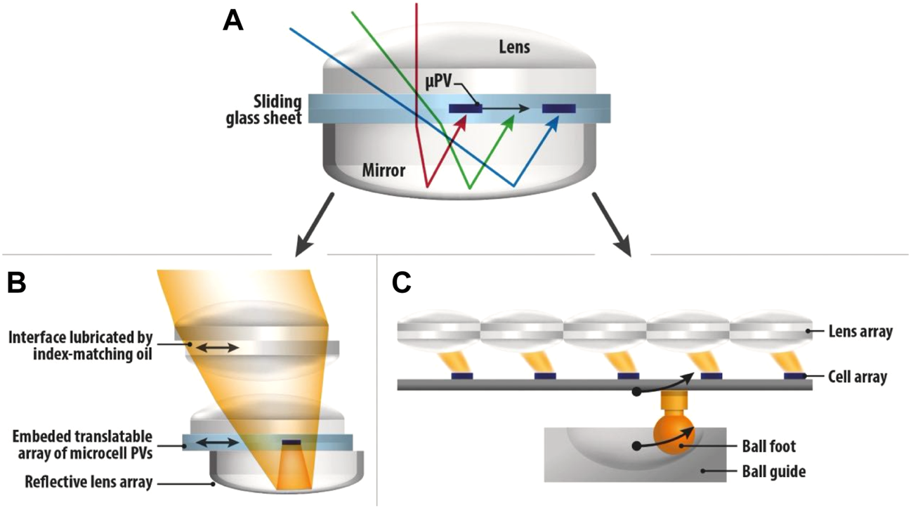 Price et al. (2017) demonstrated a high-performance planar micro-tracking CPV minimodule based on their previously presented concept of combining refractive and reflective optics to achieve image-field flattening. The design in Figure 2A entails a catadioptric stack which consists of a planoconvex top refractive and bottom reflective optics sandwiching a central glass sheet at which a 3J microscale cell is placed. The glass sheet laterally slides between the optics using an index-matching oil and is controlled by a microcontroller running an algorithm derived from feedback of the measured short-circuit current. Optical efficiency exceeds 90% at 0° angles of incidence and begins dropping beyond 70° at a practical concentration that ranges between ×300 and ×400 with standard optical materials and up to ×660 with higher index optics. The electrical conversion efficiency remains around 30% between 10:00 and 14:00 in outdoor testing and exhibits a lower efficiency than the bare 3J cell due to cell heating (cell heating, a persistent challenge for CPV, can be significantly reduced by moving towards a “micro-CPV” paradigm in which sub-mm cells are utilized to boost heat dissipation from the edge (Domínguez et al., 2017). This performance approaches that predicted by (Grede et al., 2016) in the same group, who established a phase space procedure to optimize planar micro-tracking CPV, discussed its thermodynamic limits and provided design guidelines for such systems along with the practical limits induced by absorption and dispersion.