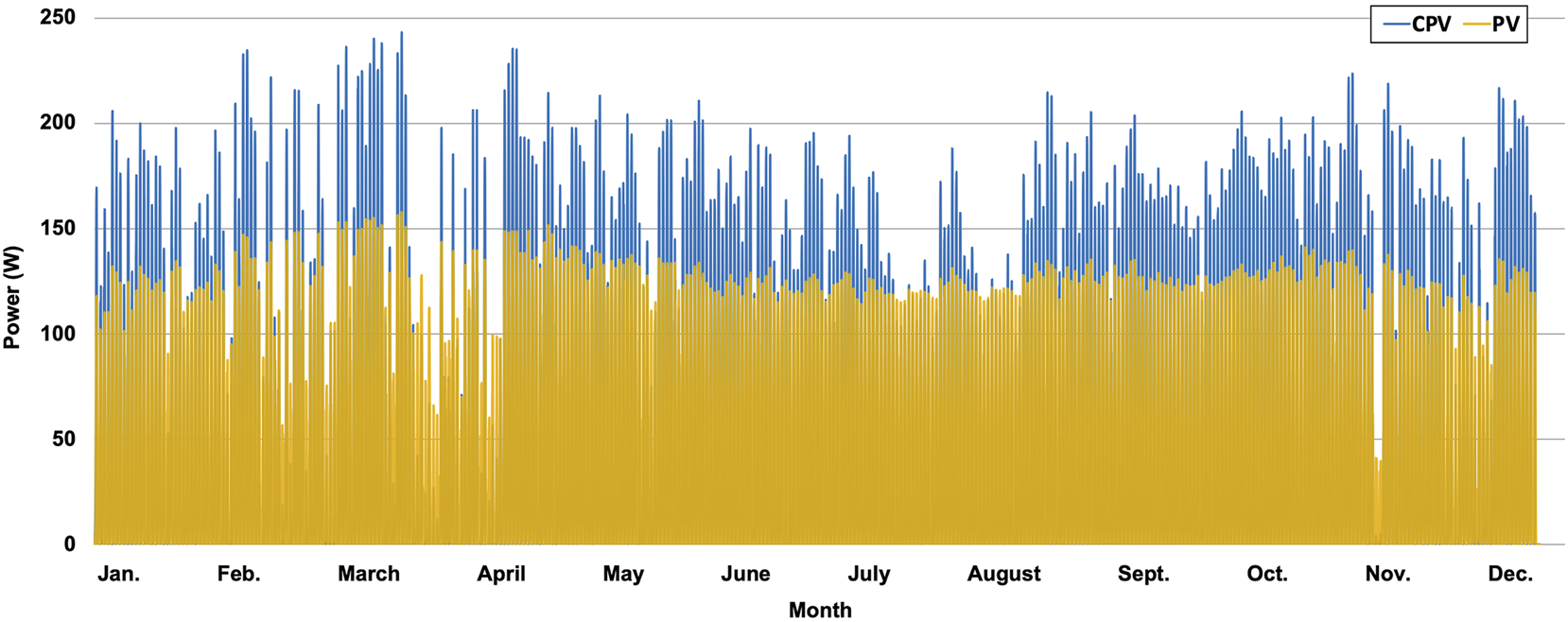 The highest stage feasible to implement at this point is the third-pass model. The first and second pass models overestimate the yearly output electric power by 26% and 12.5%, respectively, due to the ignorance of the second pass model with regards to varying efficiency at different angles of incidence and effect of temperature in addition to the independence of the first pass model on the tracking range. The trends in electric power output for the PV and TI-CPV module using the third pass model are displayed in Figure 7.