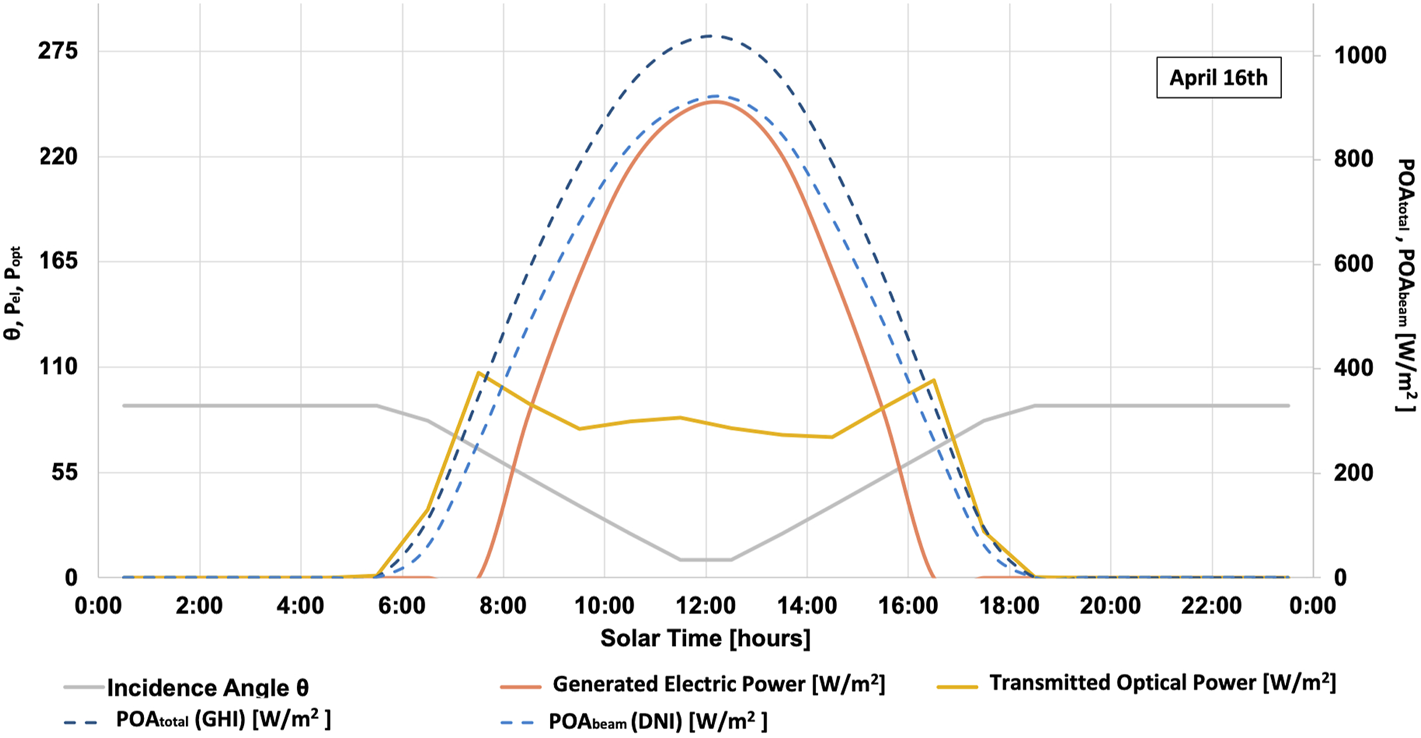 Looking at the CPV behaviour more closely, Figure 9 shows how the electric power and transmitted power vary throughout the day at different incidence angles when the module is operating in E-mode. As modelled, the electric power starts and ends accumulation when the incidence angle equals the tracking angle (±55°) and follows the change in POAdirect. As for the transmittance, it is higher outside the tracking range because in this incident, both components of light are transmitted and its dependent on the GHI while during tracking, only the diffuse is allowed through the module. Its important to notice that in the hour before and after tracking, the transmittance continues to increase and falls as soon as tracking initiates, but this behavior cannot be observed in this model due to the hourly resolution.