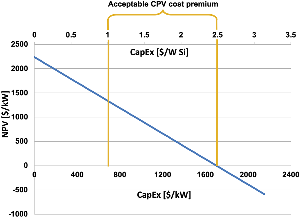 Net present value of a TI-CPV system based on the performance model; the cost premium is the increase in CapEx over a conventional ground-mounted system that can be tolerated while still breaking even at current prevailing solar electricity prices.