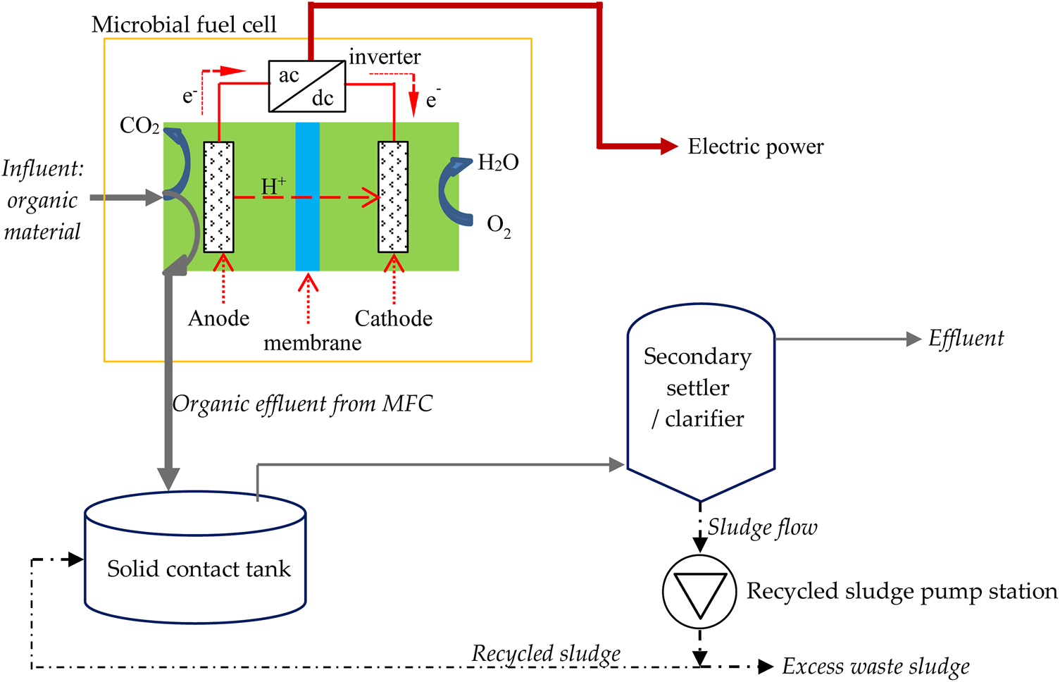 Taking into consideration the functional chain of a wastewater treatment system, an MFC can easily be used to replace/modify elements of the secondary waste and sludge treatment, whereas it should be more difficult to replace components for the removal of nutrients and heavy metals. To this end, the following alternatives have been suggested (