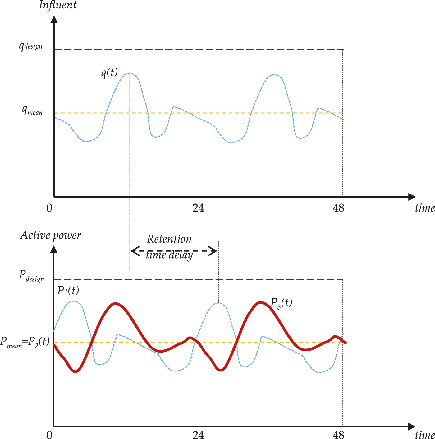 1. Conversion of a power consumption device into a partially controlled power producer: in a settlement or a city, the biological treatment plant is a significant consumer of electricity; for as shown in Logan (2008), an AS secondary treatment plant requires 1,020 ÷ 2,550 kW/(m3/s) of influent or with a membrane bioreactor requires 8,520 kW/(m3/s). By contrast, the respective MFC devices could produce a few hundred kW/(m3/s) theoretically. Since the primary waste treatment tank precedes, the waste flow can be significantly controlled, thus making possible the reduction of produced electric power variations over the 24-h period or by even adjusting it in the desired way (if this is allowed by the maximum possible influent, the biological treatment plant can process). Specifically, Figure 4 shows the correlation between influent/active power of the biological treatment plant with MFC. The produced active power curve P1(t) slides by a time delay with respect to the influent curve q(t), due to wastewater remaining at the primary treatment tanks and also because of the time required by the electrogenic bacteria to decompose the organic material. Alternatively, if through the primary treatment tanks the wastewater inflow into the secondary treatment is constant and corresponding to qmean, then the produced active power P2(t) is expected to approach the value of the mean produced active power Pmean, ignoring any environmental effects (temperature, etc.). In addition, with the help of PMS, primary treatment tanks, and perhaps small energy storage devices, the produced active power curve P3(t) can be adjusted to either the demand load (in combination with a suitable demand side management program) or to the electricity sale price, if the tariff is variable. At this point, it presents an advantage over wind turbines, photovoltaic units, and small hydroelectric plants due to the lower stochasticity of its “fuel”, but lags behind thermal units which use biomass or biogas. That is why it is suitable for installation in a smart grid. Alternatively, instead of direct power production from MFCs, one could turn to biofuel synthesis, through MECs [e.g., bioelectrochemical systems for electromethanogenesis could be used as power to biogas technology with gas storage capability (Ceballos-Escalera et al., 2020) or bioelectrochemical systems combined with heterotrophic microalgae batch reactors can convert CO2 into oil compatible biodiesel (Bolognesi et al., 2022)]. Consequently, these biofuels can be utilized in thermal power plants in a smart grid or elsewhere (Molino et al., 2015; Braco and Delfino, 2017).