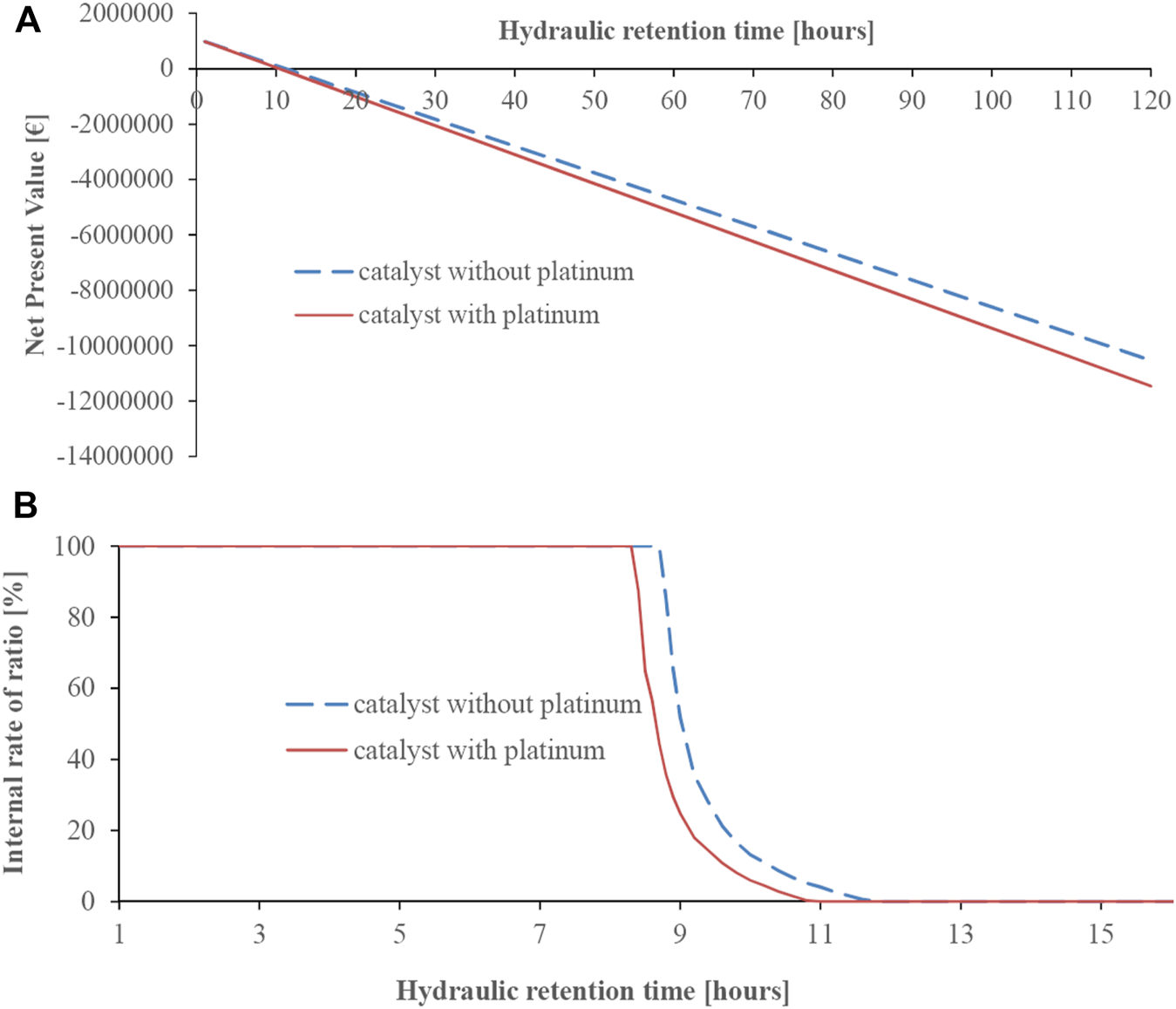 In Ding et al. (2017), a swine wastewater treatment plant was proposed, based on single-chamber air–cathode MFCs with a solution volume of 340 ml in laboratory scale, with an additional low-cost flocculation process, achieving an energy recovery of 0.664 kWh/m3 wastewater mixture (consisting of 40% raw swine wastewater and 60% denitrified effluent wastewater), a net economic profit of 0.024 $/m3 (in 2017), a COD removal efficiency of 96.6%, an ammonia removal efficiency of 60%, power density of 37.5 W/m3, a Coulombic efficiency of 21.6%, and without noting the capital cost. In Trapero et al. (2017), an extensive research for the theoretical scale-up, industrial commercialization of MFC technology, was presented based on the net present value (NPV) and internal rate of return (IRR), implementing a sensitivity analysis for the installation cost, COD removal, and Coulombic efficiency, using high organic load wastewater from a juice processing plant. The respective results were quite satisfactory and financially viable against an AS-WT. Specifically, the proposed wastewater treatment plant consisted of 10 MFCs in a series electrical connection and parallel hydraulic connection. Each MFC had a 2.25-m3 anolyte chamber, a 1.125-m3 catholyte chamber with a 20-mm methacrylate wall, carbon cloth electrodes, a catalyst cathode with platinum or without platinum, a proton exchange membrane (PEM), and its own electromechanical machinery (DC to AC converter, pump, air blower, etc.). The hydraulic retention time was determined at 10 h, and the effluent flow rate at 54 m3/day. The capital cost for the MFC installation reached 43,010 € (for a non-platinum catalyst) and 44,850 € (for a platinum catalyst), while that for an AS-WT reached 36,000€ in 2017. The detailed cost of the equipment has been presented in Table 1 of Trapero et al. (2017). So, the equivalent capital cost with respect to the effluent flow rate was 796.5 €/(m3/day) for a non-platinum catalyst, 830.6 €/(m3/day) for a platinum catalyst, and 666.7 €/(m3/day) for the AS-WT. Furthermore, at every 5 years of MFC operation, the electrodes and the PEM should be replaced with a total extended maintenance cost of 5,900 € for a non-platinum catalyst and 7,500 € for a platinum catalyst, raising the equivalent extended maintenance cost (with respect to effluent flow rate) to 109.3 and 138.9 €/(m3/day), respectively. In all the examined cases of electric energy production in combination with high organic load wastewater treatment, the NPV was positive, for an investment life period of 15 years, taking into consideration the maintenance cost per 5 years, even when the pessimistic scenarios of COD removal and of Coulombic efficiency were tested. In Logan (2015), the cost of an MFC for a wastewater treatment plant reached to 1,870 €/m2 membrane area in the case of the typical MFC configuration based on a graphite brush anode, air cathode with carbon cloth platinum electrode, PEM Nafion membrane, and polytetrafluoroethylene diffusion layer. This cost was crucial, as a reactor chamber of 1 m3 could incorporate 10 m2 of membrane, using 10 modules in a parallel design (a single anode–cathode module of 1 m2 is 10-cm thick). If new inexpensive materials for catalysts, membranes, and electrodes were used, the cost could drop at 36.55 €/m2 membrane area, making the investment financially viable. In addition, in Tommasi and Lombardelli (2017), the energy payback period was examined and found equal to 546 years for a typical MFC and equal to 2.7 years for a benthic MFC, which means that only the latter is of practical use. In 2018, the normalized recovery energy based on COD was estimated at 0.216 ± 0.048 kWh/kg-COD, for a flat panel air cathode MFC, using domestic wastewater, with anode spacing of 5 mm and hydraulic retention time (HRT) of 30 min (which is quite satisfactory), while the total electrical energy recovery was equal to 0.63 kWh/kg-COD (Park et al., 2018). That increase was due to methane emission at a subsequent treatment stage. The proposed MFC solution was inferior only to the anaerobic system (0.99 kWh/kg-COD). In some cases, no electrical production is achieved, but the electrical consumption is limited, i.e., ammonium nitrogen recovery from wastewater as fertilizer needs 1.6 kWh/kgN using a bioelectrochemical system (Losantos et al., 2021) or 6.1 to 8.2 kWh/kgN using a three-chamber bioelectroconcentration cell instead of 25 kWh/kgN in AS process and fertilizer production (Koskue et al., 2021). In bioelectrochemical systems, CO2 is converted to CH4 through electromethanogenesis having a specific energy consumption of 16–18 kWh/m3 CH4 (Rodríguez-Alegre et al., 2019). Similarly, no electrical consumption has been referred to in nutrient recovery systems from human urine (Freguiea et al., 2019).