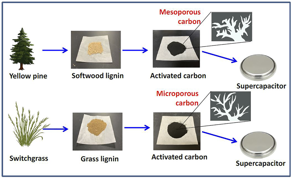 In this work, a novel activation technique was developed for preparing activated carbons from two types of lignin, yellow pine (YP, softwood lignin) and switchgrass (SG, grass lignin). The influence of lignin molecular structure on both surface texture and pore size distribution of the activated carbons was systematically examined. The electrochemical performance of supercapacitors assembled with carbon electrodes was also explored using cyclic voltammetry (CV), charge-discharge cycling, and electrochemical impedance spectroscopy (EIS) in aqueous electrolytes. Techno-economic analysis was performed to assess the economic viability of the process and demonstrate the efficacy of using lignin with different chemical constituents as precursors for preparing highly porous activated carbons used as electrode material in supercapacitors.