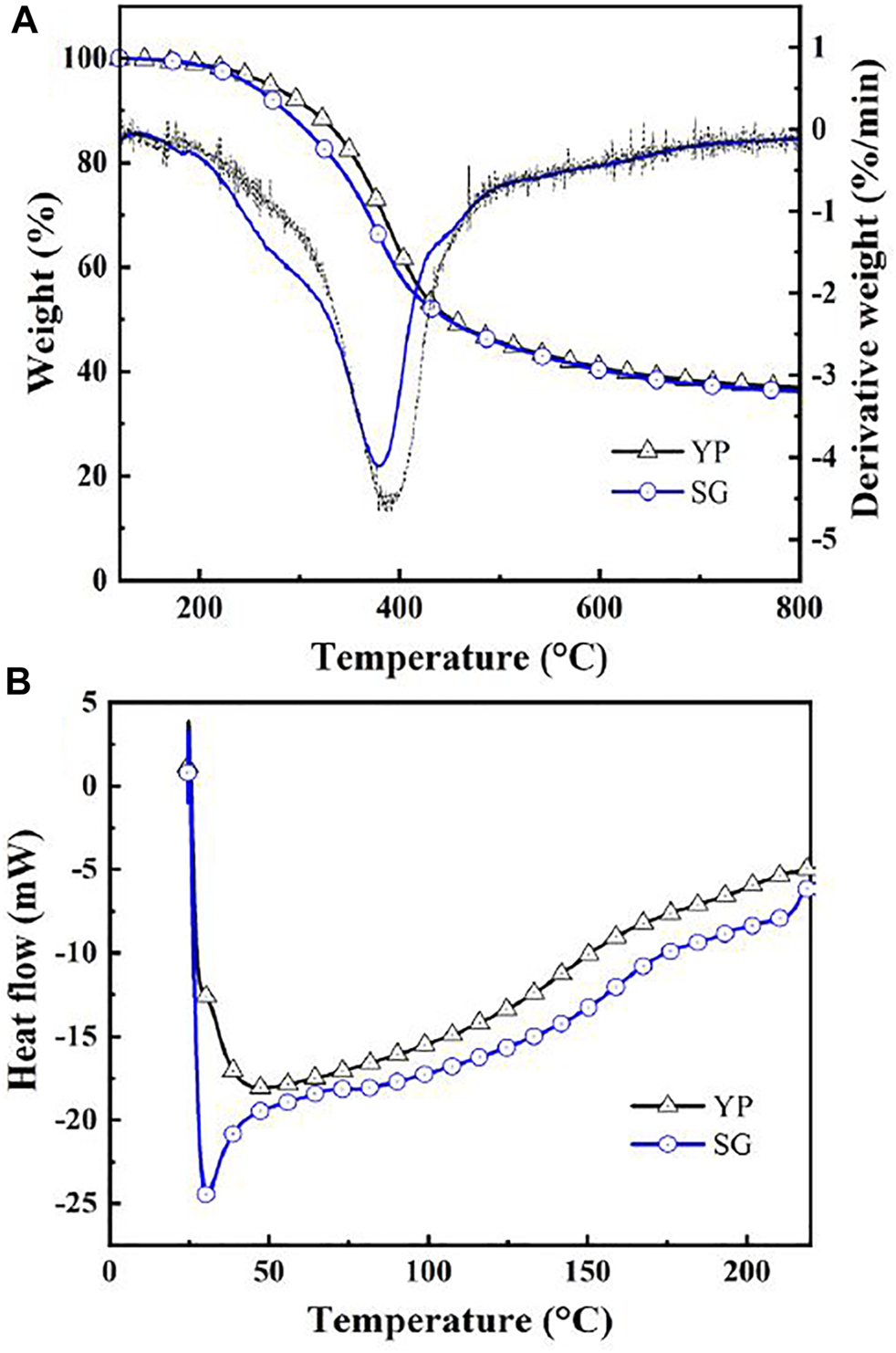 (A) TGA and (B) DSC curves of YP and SG lignin precursors.