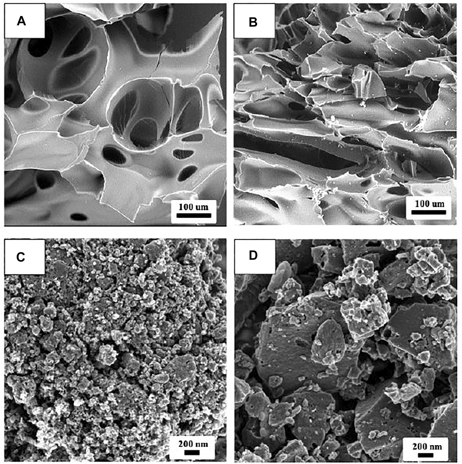 SEM images of different lignin precursors: (A) YP-py and (B) SG-py and SEM images of different ball-milled AC samples: (C) YP-AC and (D) SG-AC.