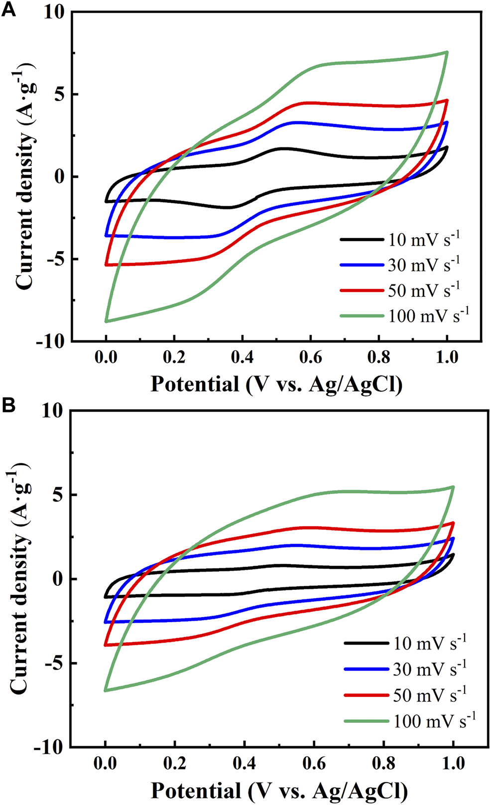 Cyclic voltammetry profiles of (A) YP-AC and (B) SG-AC electrodes in 1 M H2SO4 at different scan rates.