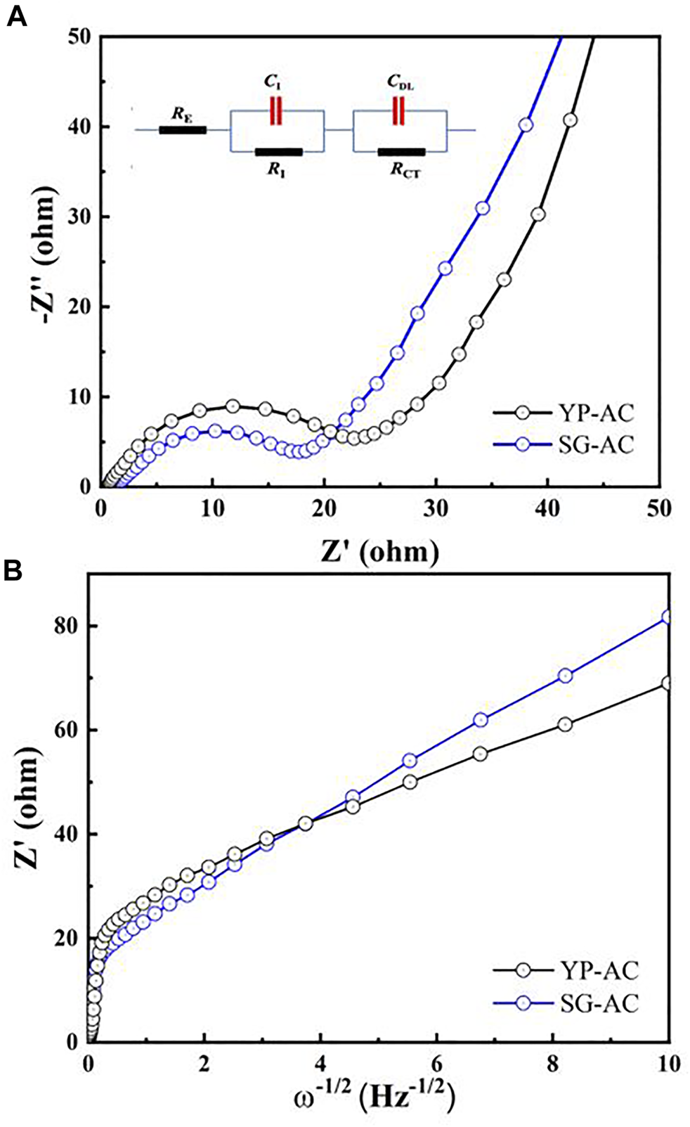 The EIS technique was employed to analyze the electrochemical behavior of the capacitors assembled with various lignin-based electrodes. The impedance spectra of different capacitors are shown as Nyquist plots in Figure 9A. As illustrated in Figure 9, the high-frequency intersection with the real axis represents the electrolyte resistance (RE), followed by a single quasi-semicircle in the high-frequency region (100 kHz - 1 Hz). The semicircle in the high-frequency region is due to combined effect of interfacial resistances (between activated carbon composites and current collector (RI//CI)), as well as the charge transfer impedance (RCT//CDL, a double-layer capacitance in parallel with a resistance) (Kinoshita, 1988). The EIS spectra also include a linear regime in the low frequency region corresponding to the capacitive response of the porous carbons (McCreery et al., 1994). The equivalent circuit model used for simulating the impedance behavior of the capacitors is shown in the inset of Figure 9A. The Z-view software package was adopted for fitting the EIS spectra with the equivalent circuit model. The overall resistance, so-called “equivalent series resistance”, RES (= RE + RI + RCT), was composed of the electrolyte resistance, interfacial impedance, and charge transfer resistance. The RES values were 28.7 and 24.8 Ω for YP and SG capacitors, respectively. The slightly higher RES value of YP electrode is attributed to higher surface area and more complex porous structure, resulting in the high resistance for charge transfer within the pore structure.