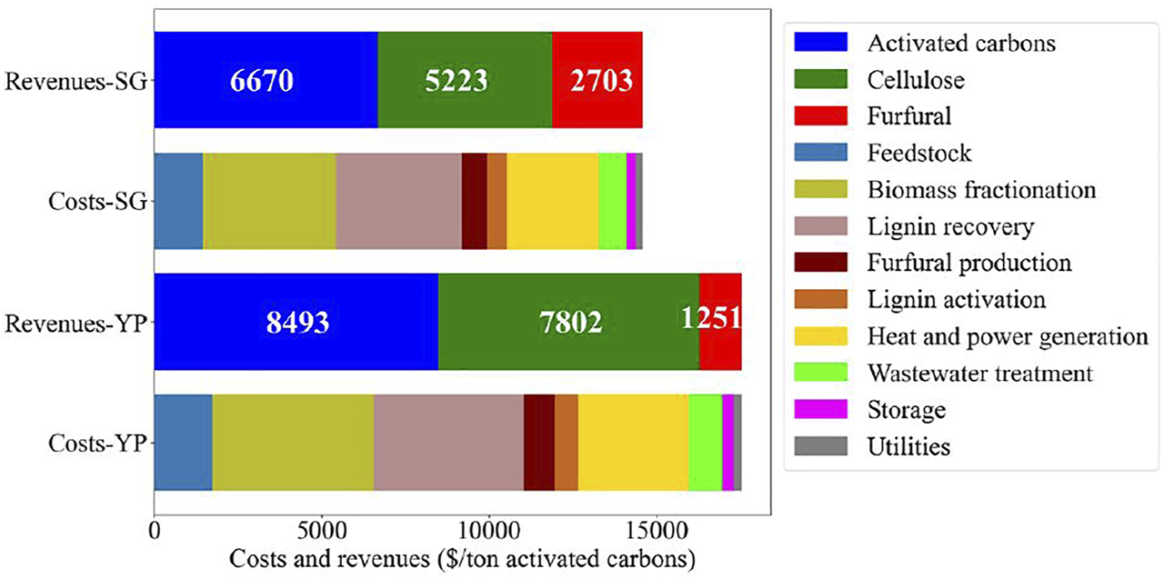 Third, the capital costs as well as the variable and fixed operating costs are estimated. All equipment costs are adjusted to a common year (2019) using appropriate cost indices. The installed costs of all the areas except A400 are estimated based on the article by Alonso et al. (Alonso et al., 2017) using appropriate scaling factors. Detailed installed equipment costs of A400 are given in Supplementary Table S6 and a summary of the capital costs of different areas are provided in Supplementary Table S7. Total capital investment (TCI) is obtained by adding equipment installed costs to the costs associated with warehouse, site development, piping, office construction, project contingency, etc. (Davis et al., 2018). A summary of different components of TCI is given in Supplementary Table S8. The TCI of YP and SG biorefineries are estimated to be $229 million and $189 million, respectively. The main reason for the higher TCI of the YP-based biorefinery is the lower yield of activated carbons. The annual fixed operating costs accounting for salaries, maintenance, and insurance are estimated to be $9.3 million and $8.5 million for YP and SG biorefineries, respectively. Based on the raw material prices listed in Supplementary Table S9, the annual variable operating costs of YP and SG biorefineries are estimated to be $15.2 million and $12.1 million, respectively. The main reason for the higher TCI and operating costs of the YP-based biorefinery is the lower yield of activated carbons. Thus, to obtain the produce the same amount of activated carbon, YP-based biorefinery requires larger equipment and more energy to process higher material flows.