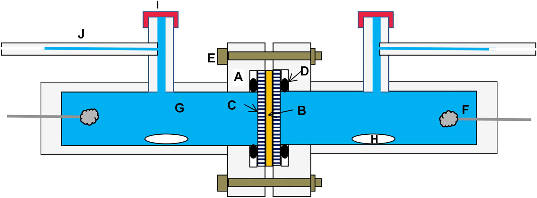 Scheme of the electro-osmotic cell. A, plexiglass cell; B, membrane; C, perforated plate; D, o’ring; E, bolt; F, Ag/AgCl electrode; G, HCl solution; H, stirrer; I, septum; J, capillary tube.
