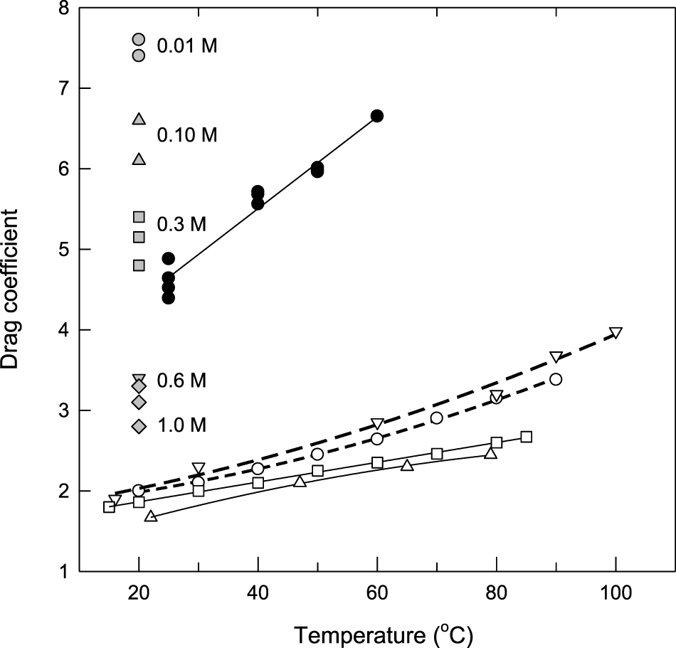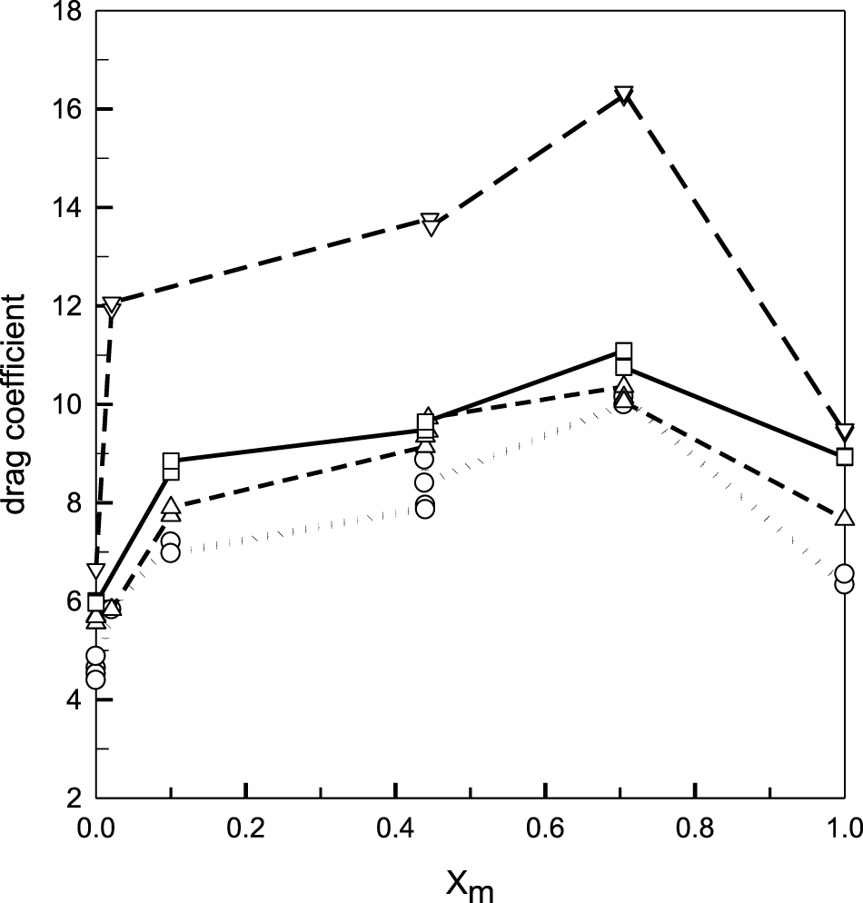Total drag coefficient as a function of methanol concentration at different temperatures: (ο) 25°C, (Δ) 40°C, (□) 50°C, and (∇) 60°C. The lines are just a guide for the eyes.