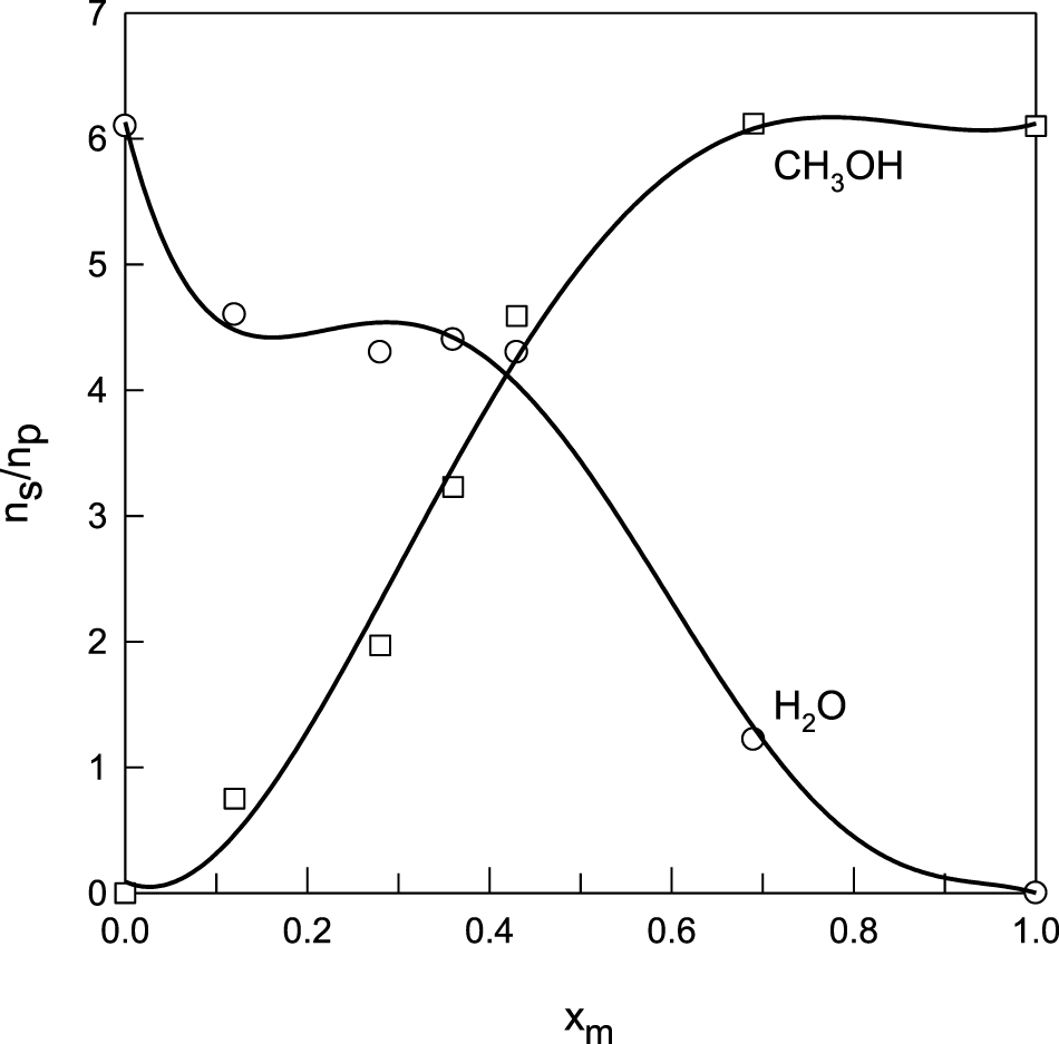 Sorption of water and methanol in Nafion, expressed as moles of solvent per mole of polymer, as a function of the solvent composition. Data from Diaz et al, 2012.