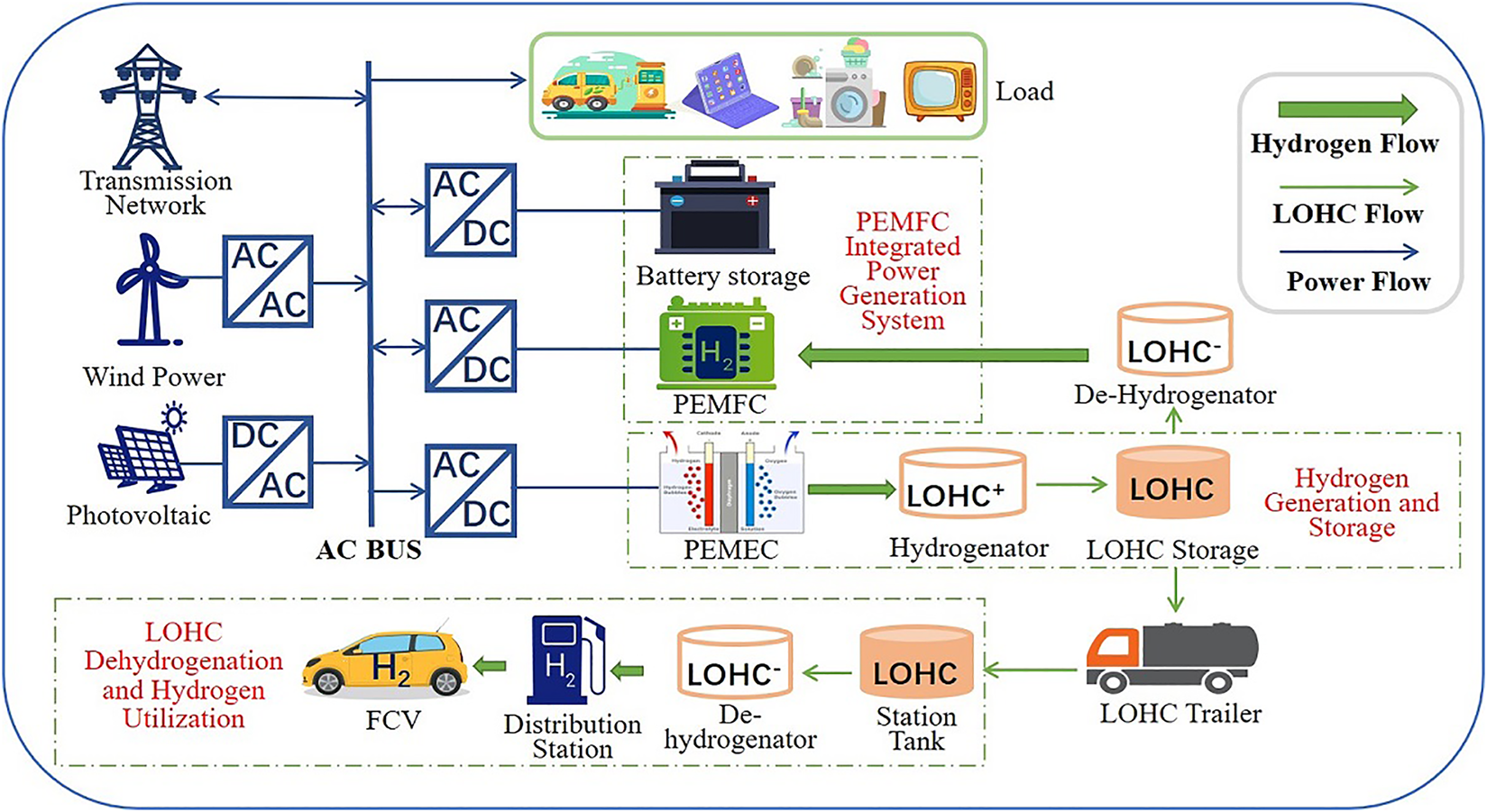 hydrogen generation, fuel cell, liquid organic hydrogen carrier, microgrid, renewable energy, grid auxiliary service