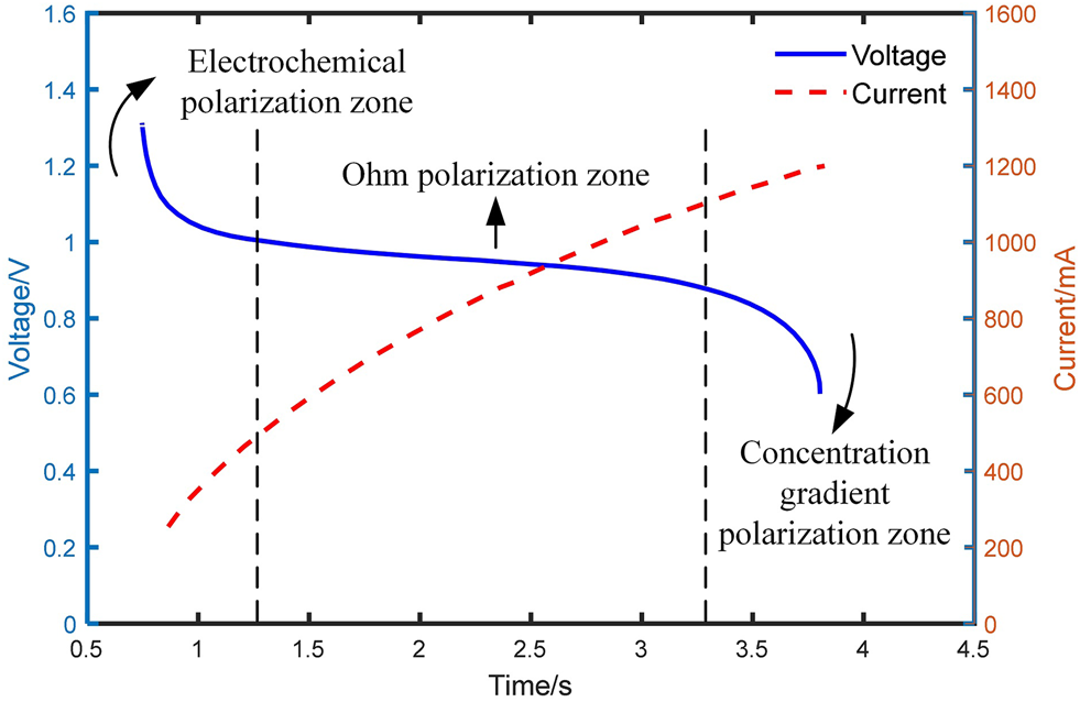 Considering the voltage protection threshold of the PEMFC stack, the output current shows a rise while the voltage drops and rises back when the current enters a plateau. The process keeps repeating inside the PEMFC. The response of the PEMFC is too slow to respond to rapid changes in load alone.