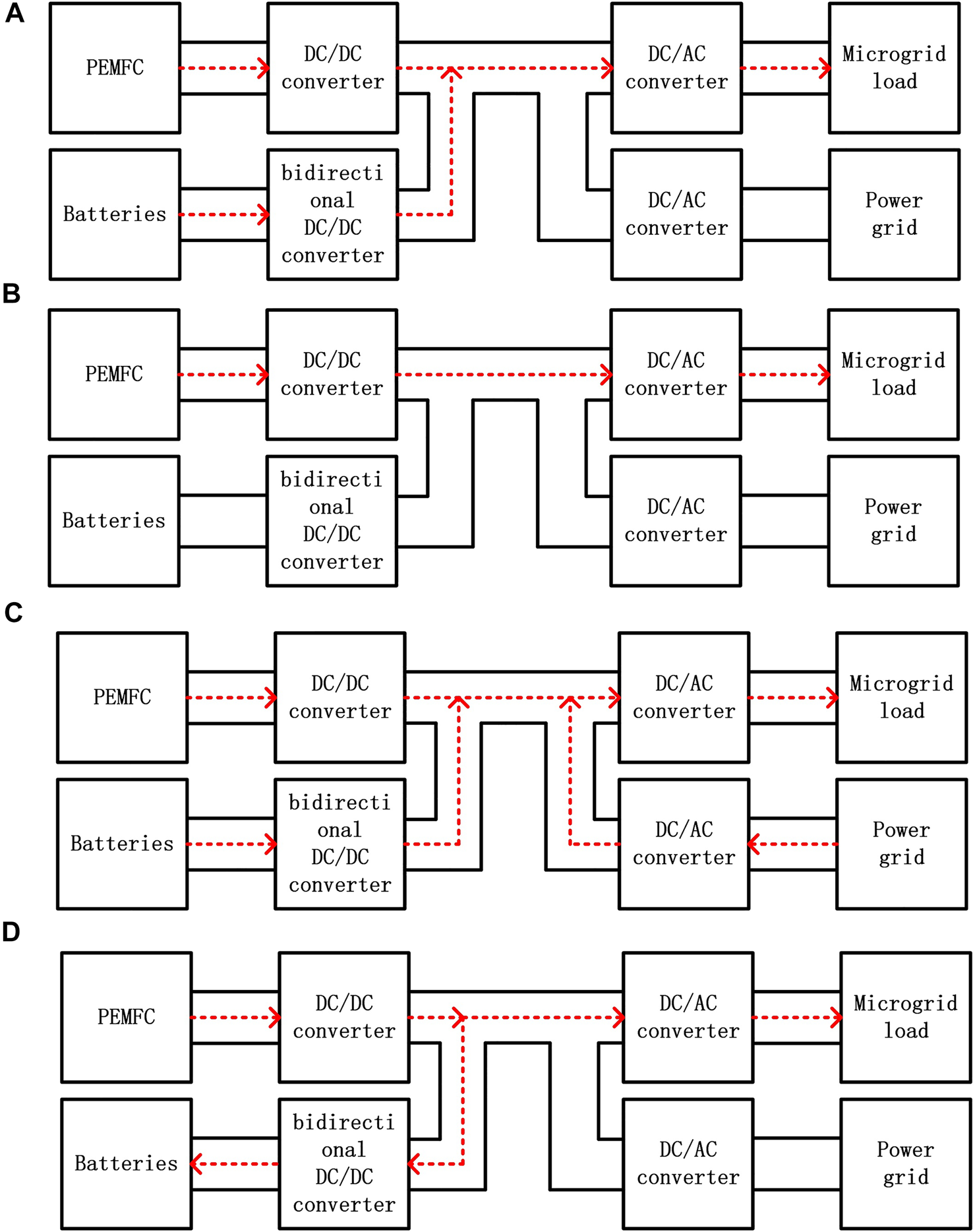(A) Energy flow diagram of mode I, (B) Energy flow diagram of mode II, (C) Energy flow diagram of mode III, (D) Energy flow diagram of mode IV.