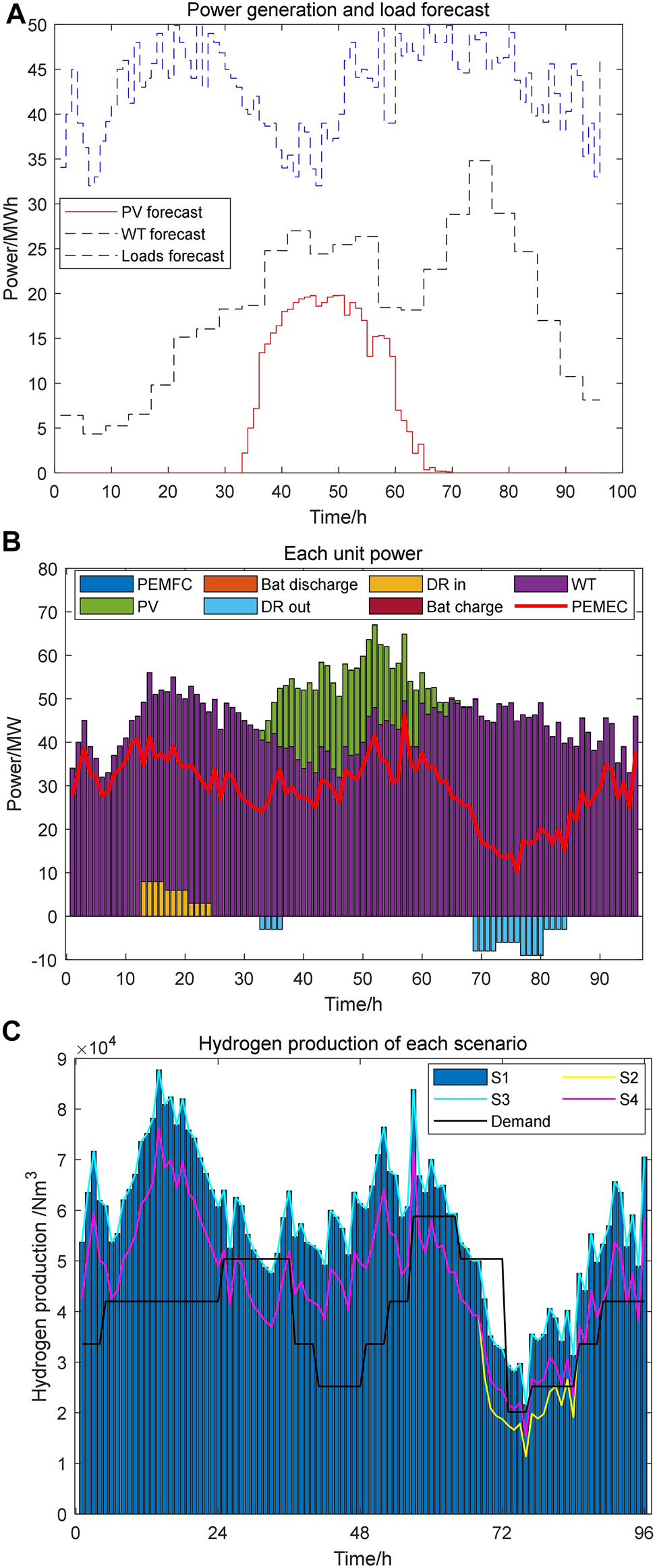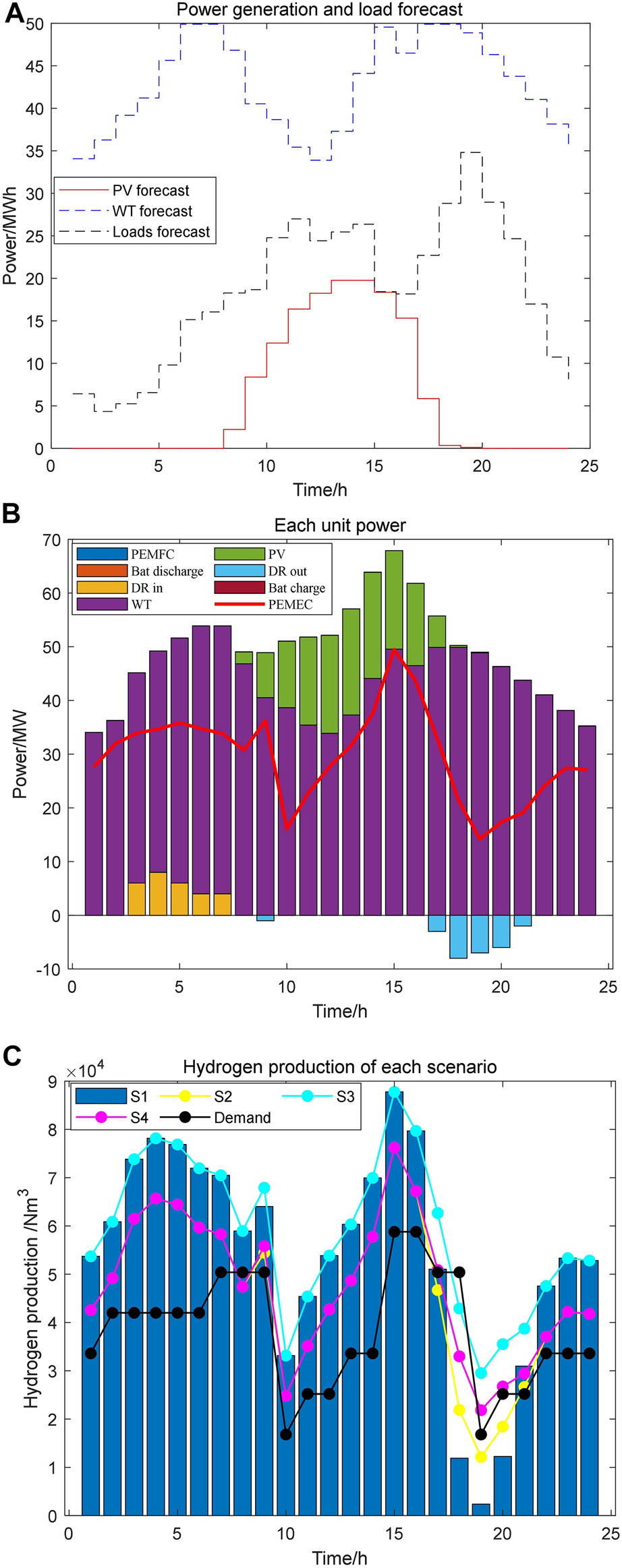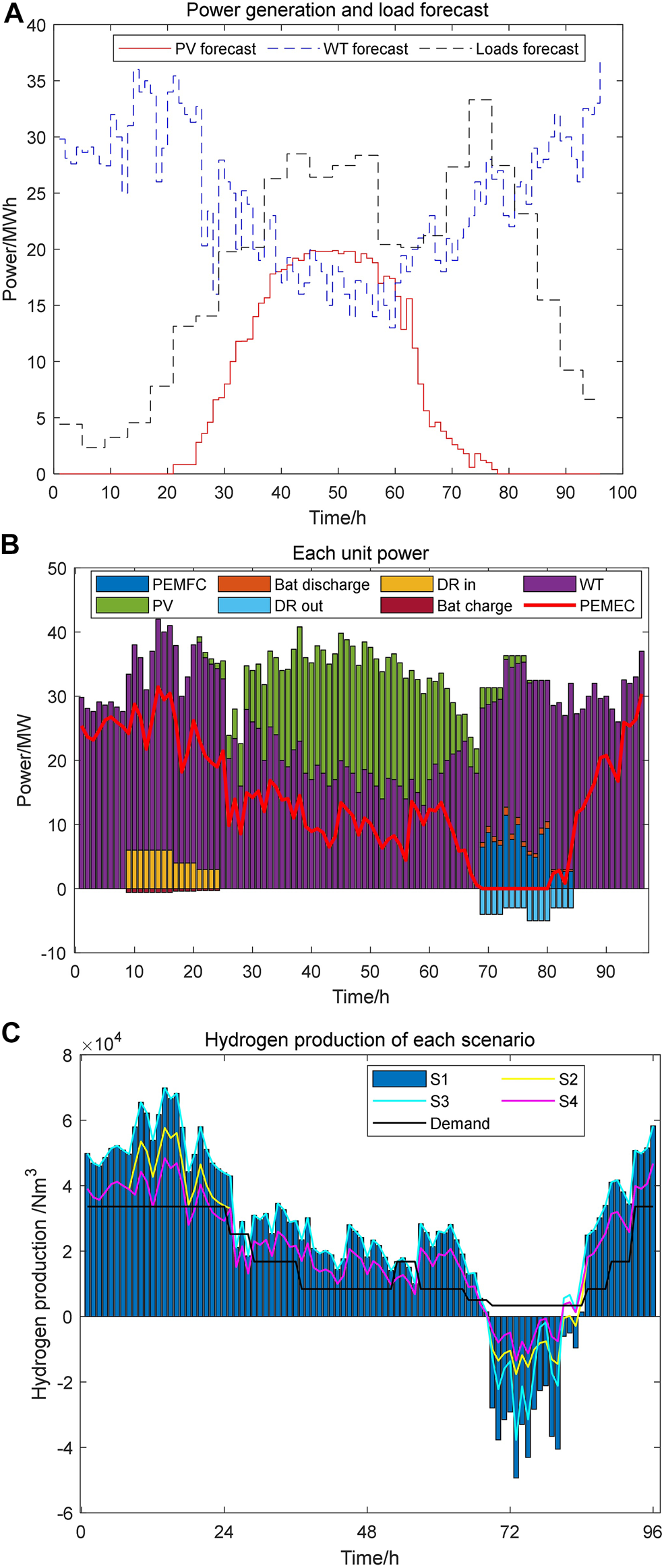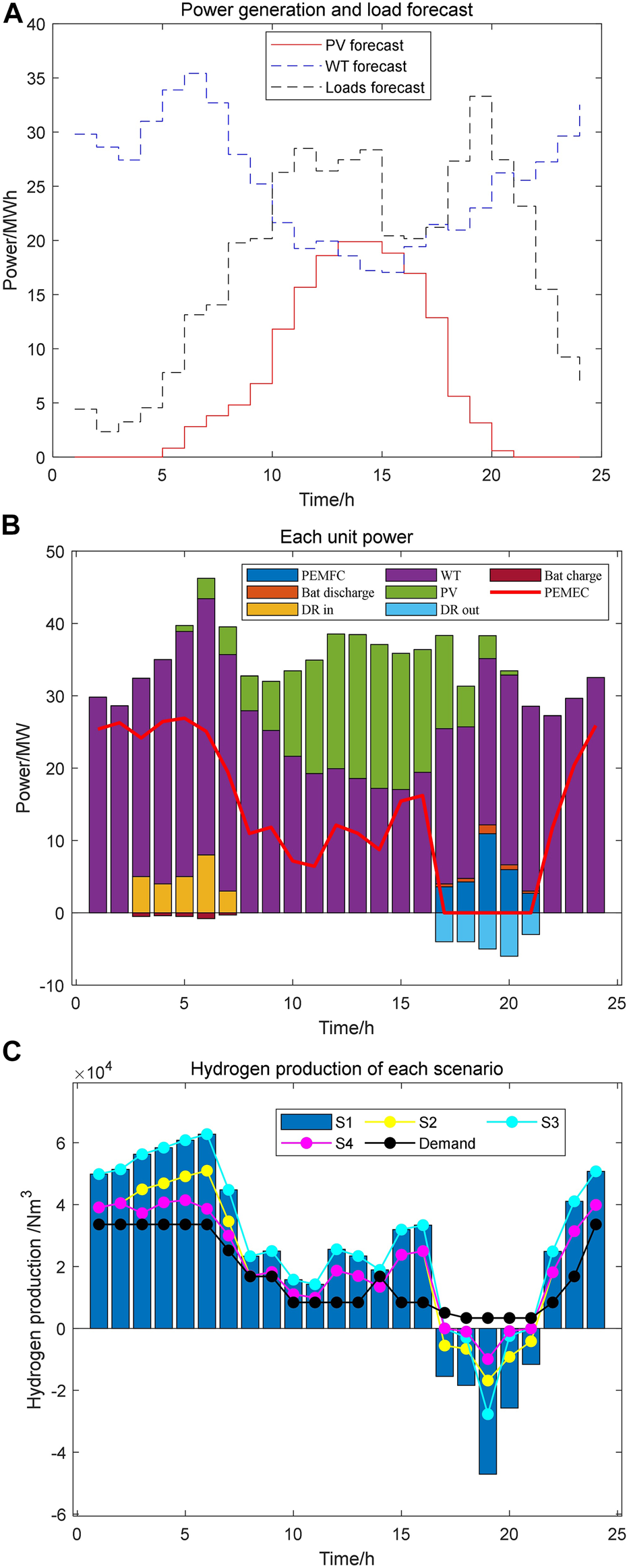 The optimization goal of the day-ahead scheduling is to maximize the revenue of the microgrid. By optimizing the scheduling of generation, energy storage and electricity market auxiliary services, the operating costs of the microgrid can be reduced. It can also improve hydrogen production and grid auxiliary service revenue. The objective function is shown as follows.Where is the scheduling period, is the revenue of EHCM, is the operation and maintenance cost of the microgrid.