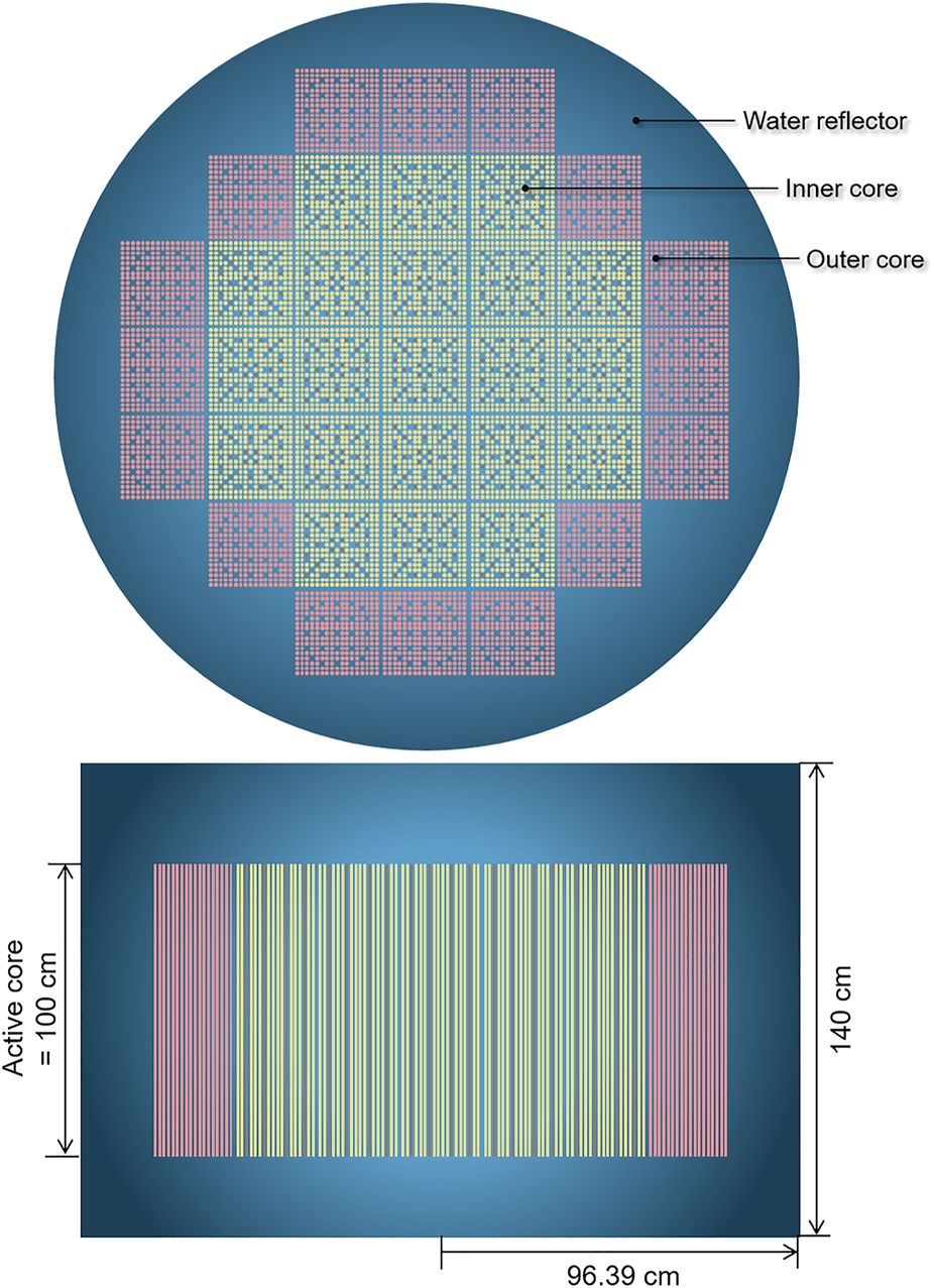 A small modular reactor (SMR) core has been considered for numerical analysis. The detailed configurations of the reactor core are presented in Figures 2A,B. Total 37 fuel assemblies are loaded in the core. There are two different types of fuel assembly. One fuel assembly contains higher-enriched U fuel rods and Gadolinia (Gd2O3) burnable absorber pins, while the other one solely consists of lower enriched fuel rods. The fuel rods are arranged in a 17 by 17 array and the fuel assembly includes 25 guide tubes and 264 fuel rods. Among them, 24 fuel rods contain Gadolinia burnable absorbers as shown in Figure 3. The core is surrounded by a water reflector. The diameter and height of the core are 192.78 cm and 140 cm, respectively. The reactor power is 100 MW thermal. The detailed specifications of the SMR core can be found in Table 1.