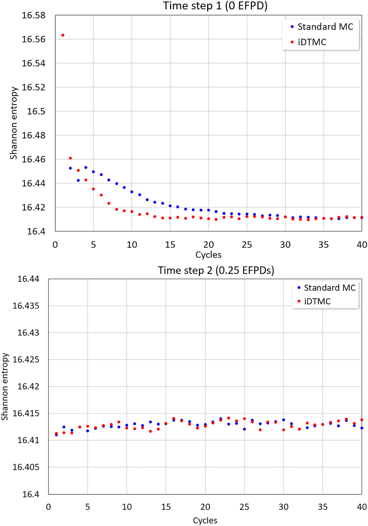 The convergence of the fission source distribution has been characterized by the Shannon entropy. Figures 4A,B show the behavior of the Shannon entropy at the first (0 EFPD) and second (0.25 EFPD) time steps, respectively. The entropy value is highest at the first transport cycle because of uniformly distributed particles and gradually decreases along with the simulation at the first time step. The entropy in the standard MC method reaches a stationary state at around cycle 25, while the iDTMC method more quickly attains the source convergence at around cycle 15 due to the CMFD acceleration. The fission source distribution does not change significantly with the fuel burnup, so the entropy values are already close to the stationary state from the initial transport cycle after the first time step as shown in Figure 4B.