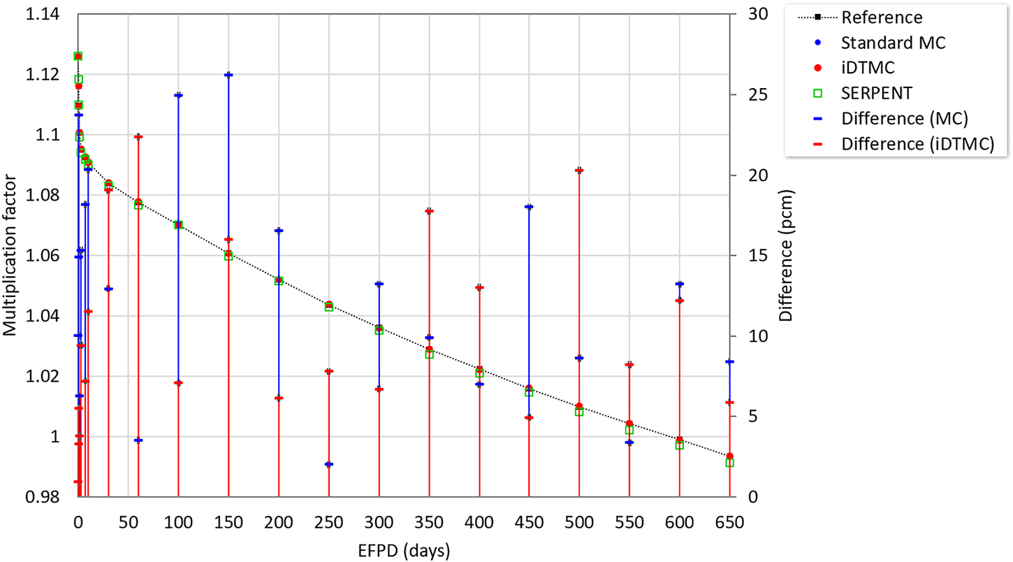 The multiplication factors were calculated at certain time steps over 650 EFPDs. The SMR core was depleted with the short time bin at the beginning of the cycle to properly take into account the depletion of the burnable absorber and the buildup of the neutron-absorbing fission products. Figure 5 describes the burnup-dependent criticalities and the differences compared to the reference solution. The criticality quickly decreases over the early depletion steps due to Xe build-up, and gradually decreases after 10 EFPDs. The RMS error for the burnup dependent criticalities is estimated to be 12.8 pcm for the iDTMC method and 17.1 pcm for the standard MC method. In short, the iDTMC method shows a better agreement with the reference solution compared to the standard MC method.